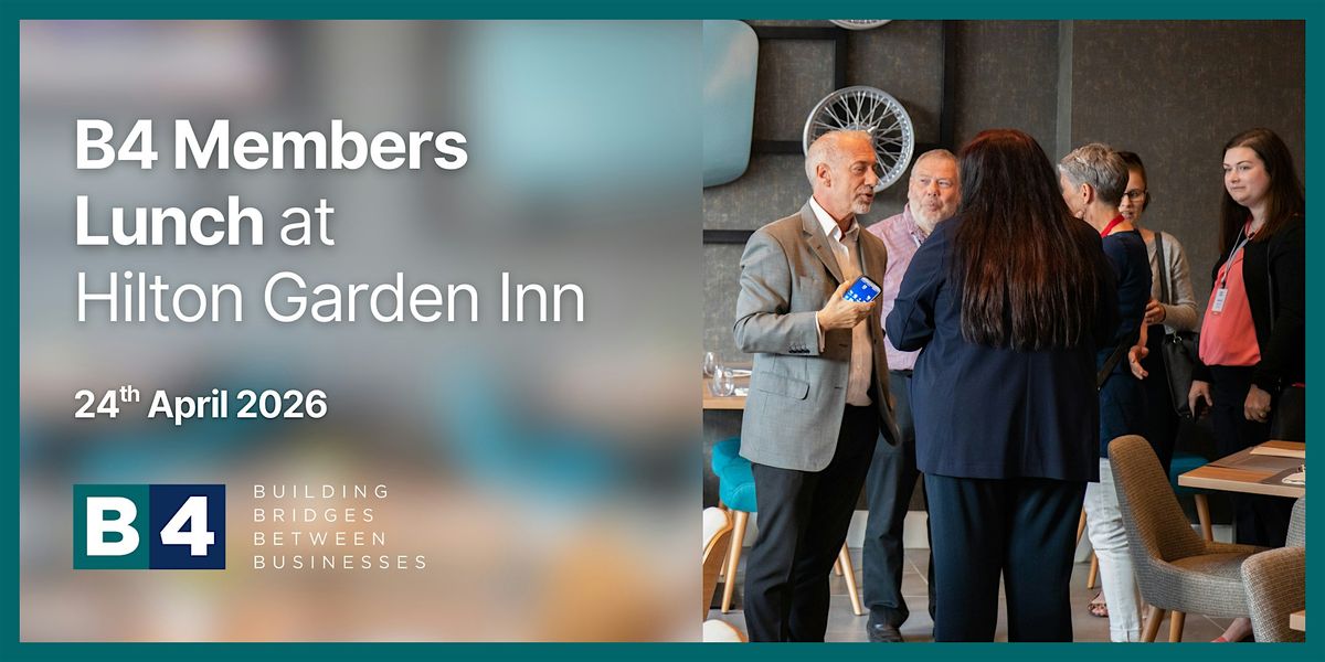 Join B4 Members for a relaxed lunch at the wonderful Hilton Garden Inn. Connect with B4 Members whilst enjoying a fabulous two course meal with drinks included.