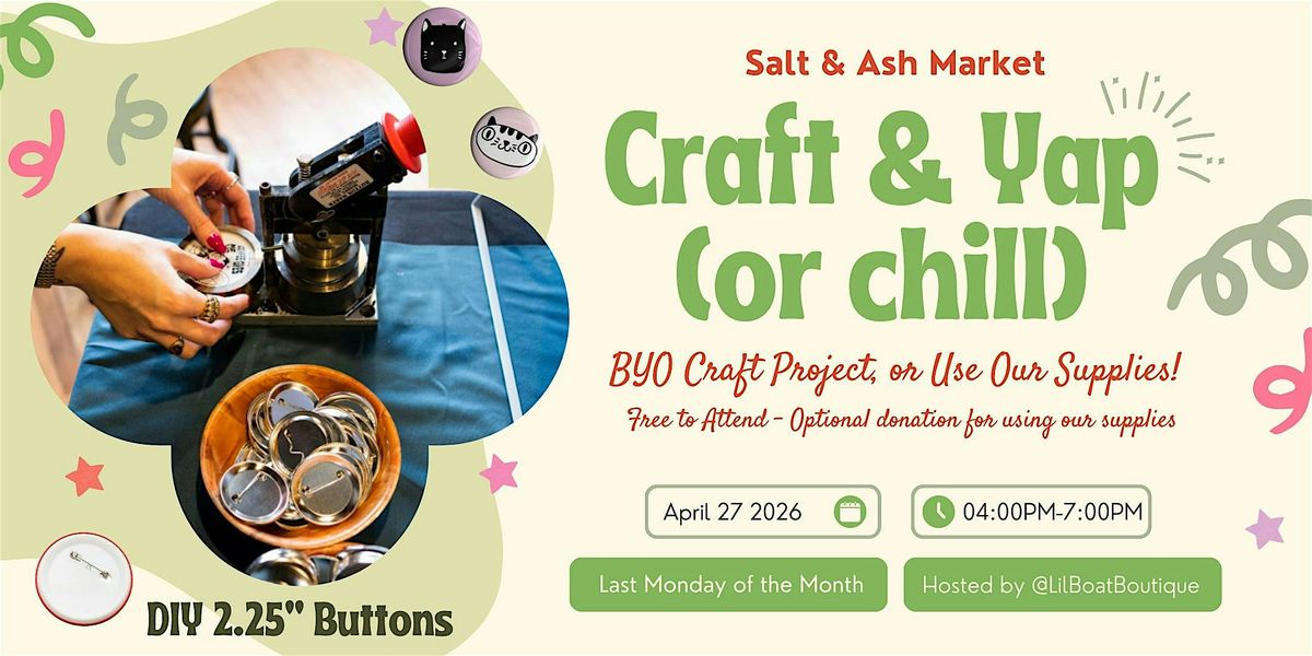-Join us on the last Monday of each month for a Craft & Yap (or chill) session! From 4 to 7pm, craft at our workshop table! Bring Your Own Craft, or use our supplies! Each month we'll have a rotating craft available! We don't require, but encourage a donation to help cover supply costs. A QR code and cash box will be provided at the event.