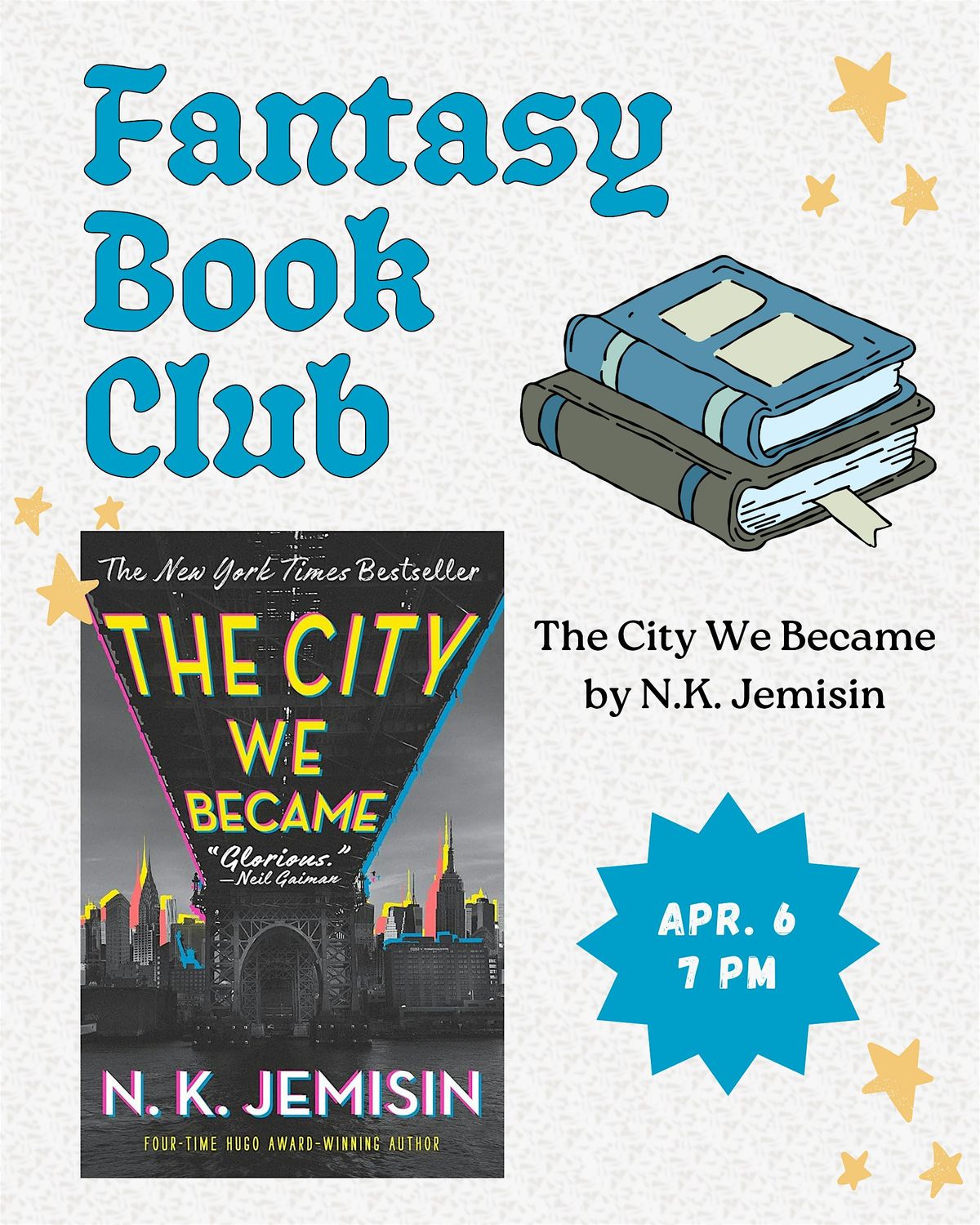 Join us for our monthly Fantasy Book Club! For April, we will be discussing THE CITY WE BECAME by NK Jemisin.About this Event