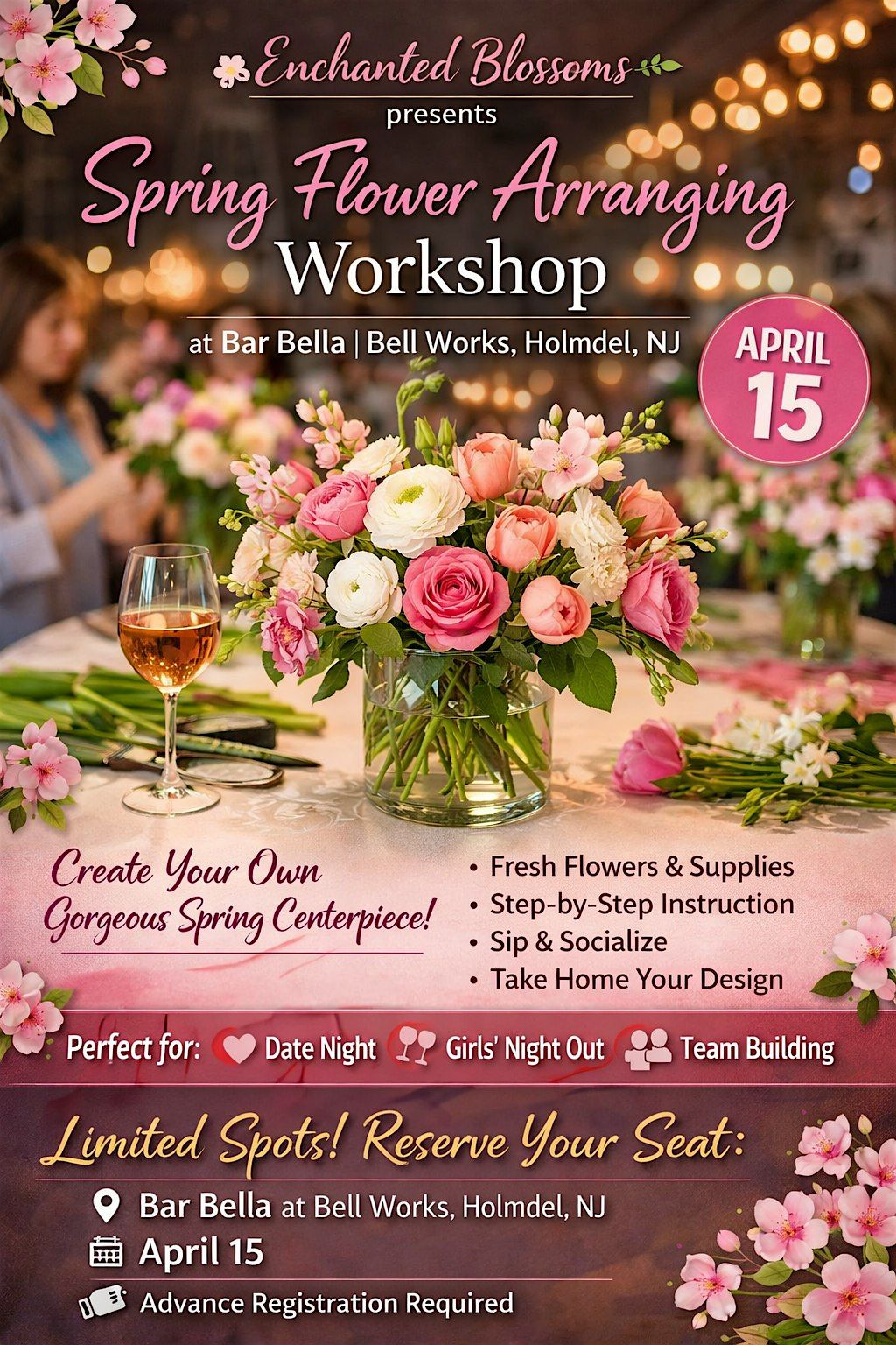 Join Enchanted Blossoms for a beautiful and inspiring evening of floral design at Bar Bella inside Bell Works on April 15!
