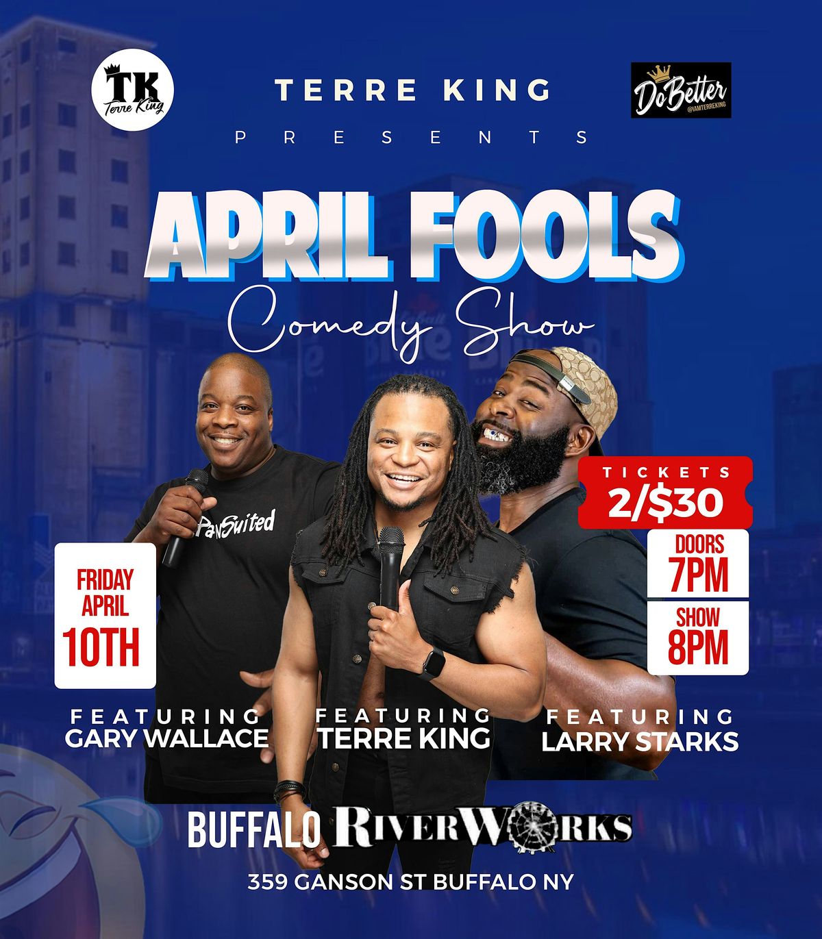 Terre King presents the April Fools Comedy Show hosted by Terre King featuring Gary Wallace and Larry Starks for a night of high-energy stand-up and nonstop comedy.