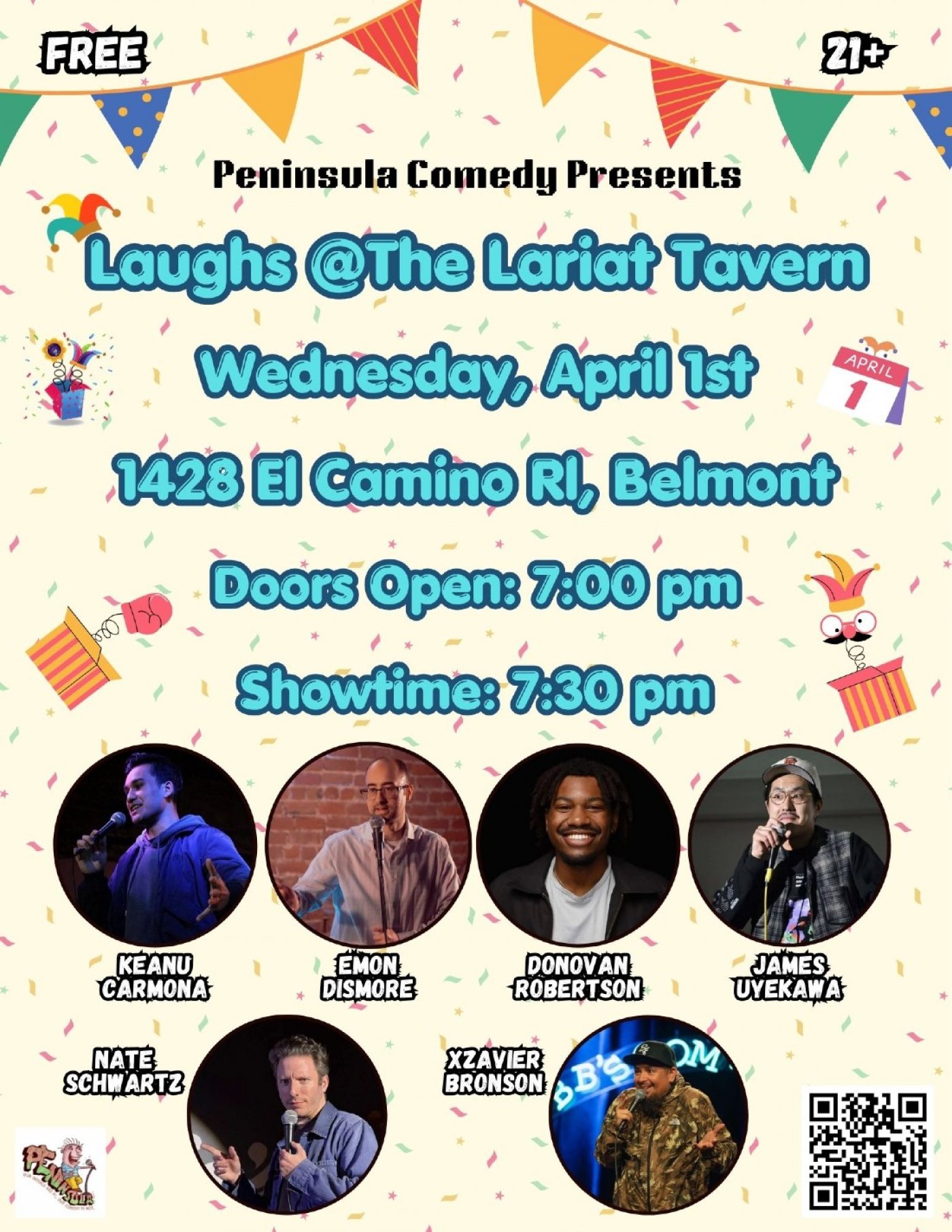 Feature Comedians: Keanu Carmona (The Function), James Uyekawa (Peacock Lounge), Nate Schwartz (San Jose Improv), Donovan Robertson (Peninsula Comedy), Xzavier Bronson (San Jose Improv), and our Headliner is Emon Dismore (Peninsula Comedy).