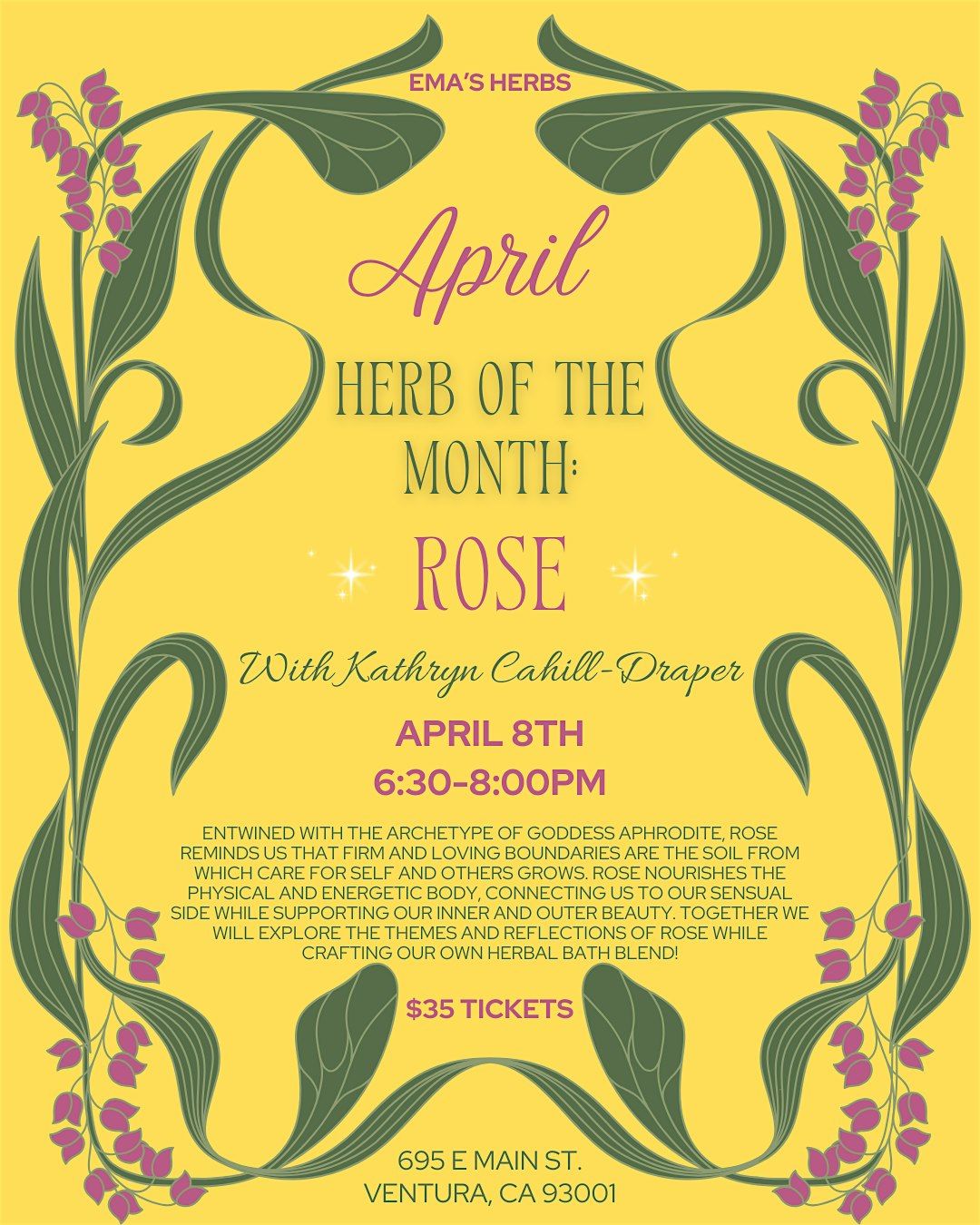 This month we are exploring the self-love focused aspects of the Taurus season! Entwined with the archetype of goddess Aphrodite, rose reminds us that firm and loving boundaries are the soil from which care for self and others grows. Rose nourishes the physical and energetic body, connecting us to our sensual side while supporting our inner and outer beauty. Together with herbalist and green witch, Kathryn Cahill-Draper, we will explore the themes and reflections of rose while crafting our own herbal bath blend!