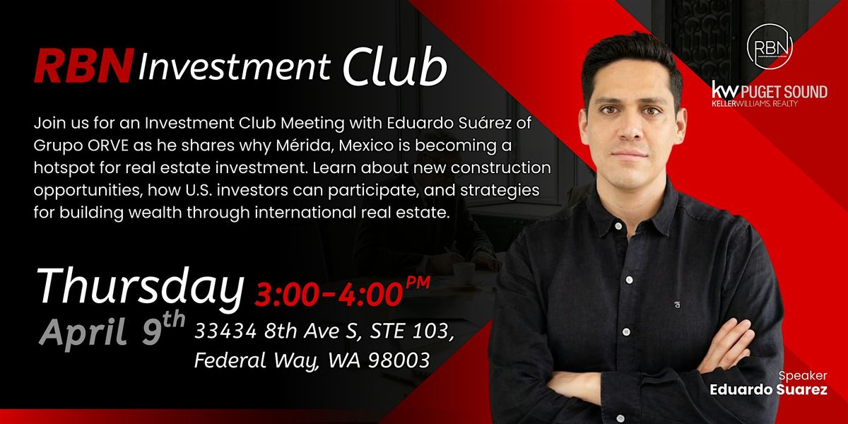 Join us for an Investment Club Meeting featuring Eduardo Suárez, Certified Real Estate Advisor and Commercial Manager at Grupo ORVE, a leading real estate developer in Mérida, Yucatán, Mexico.