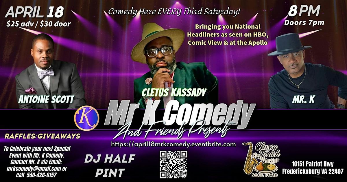 Get ready for a night you won’t forget! MrKComedy is bringing the hilarious Comedians Antoine Scott and headlining Cletus Kassady to Fredericksburg VA for more than just a comedy show—it’s a full-blown experience! 🎤🔥Join us at the Classy Touch resturant (10151 Patriot Hwy) for an evening packed with side-splitting laughs, great music, delicious food, and refreshing drinks. Whether you’re looking for the perfect date night or a fun outing with friends, this is the place to be!