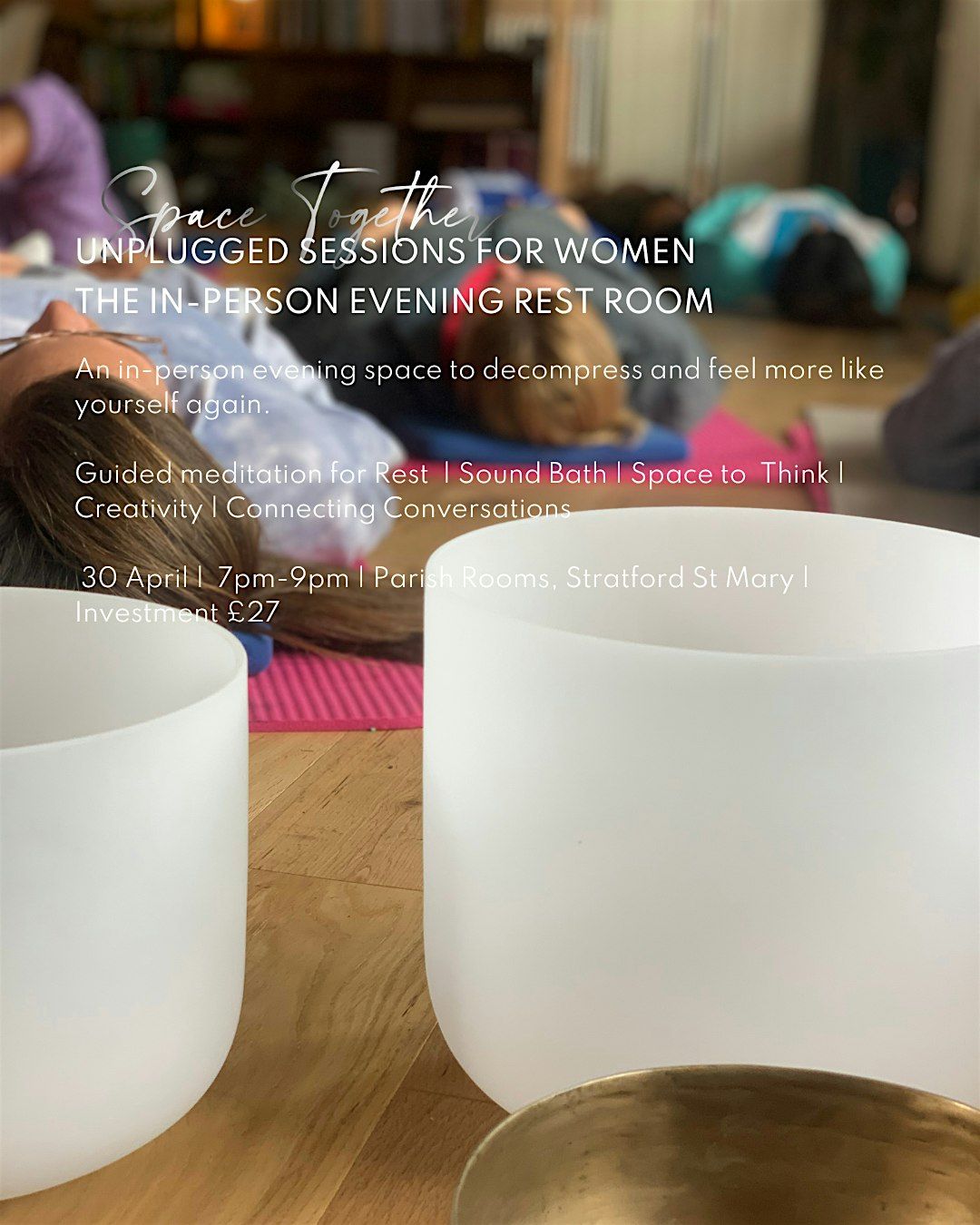 The evening is designed to work with your nervous system, not against it. You don't have to force yourself to relax; the yoga nidra, the sound and the stillness of the space do that work gradually, and in their own time.