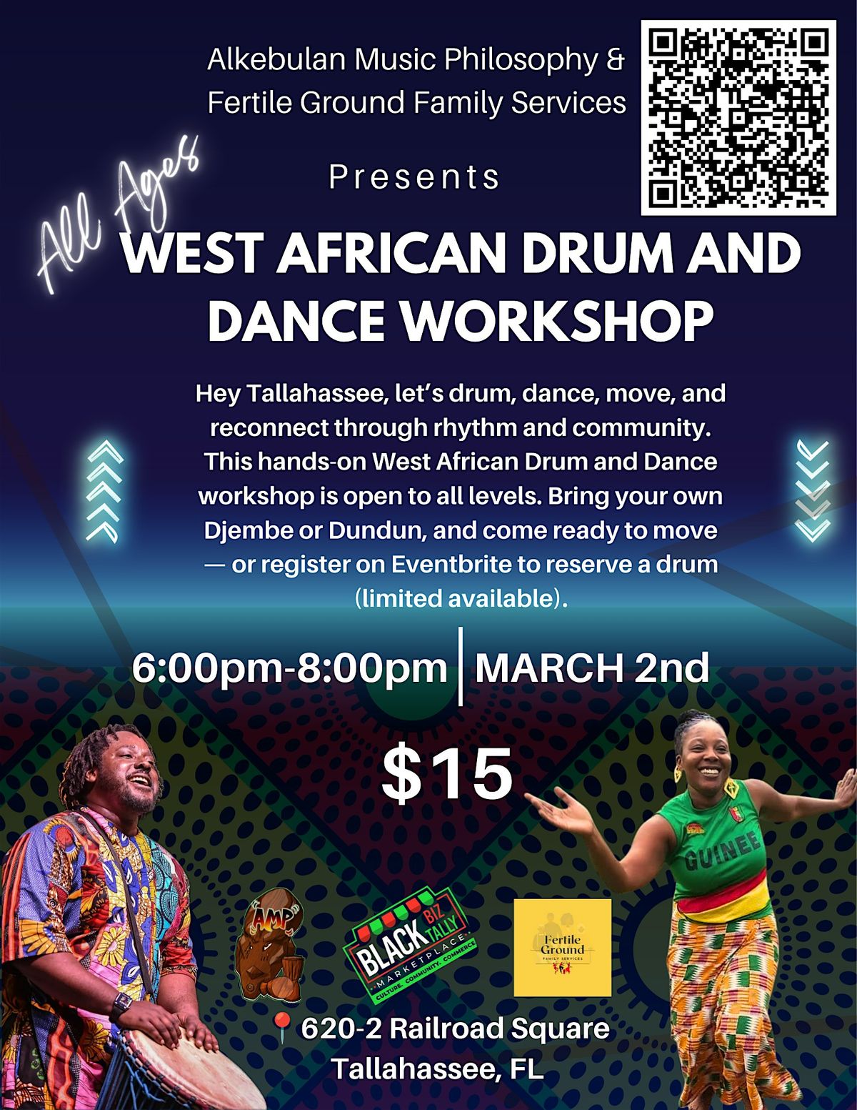 On April 27th from 6:00 p.m. to 8:00 p.m., we gather at the Black Biz Tally Marketplace, located in the heart of Tally, to celebrate the living sounds of West African drum and dance.