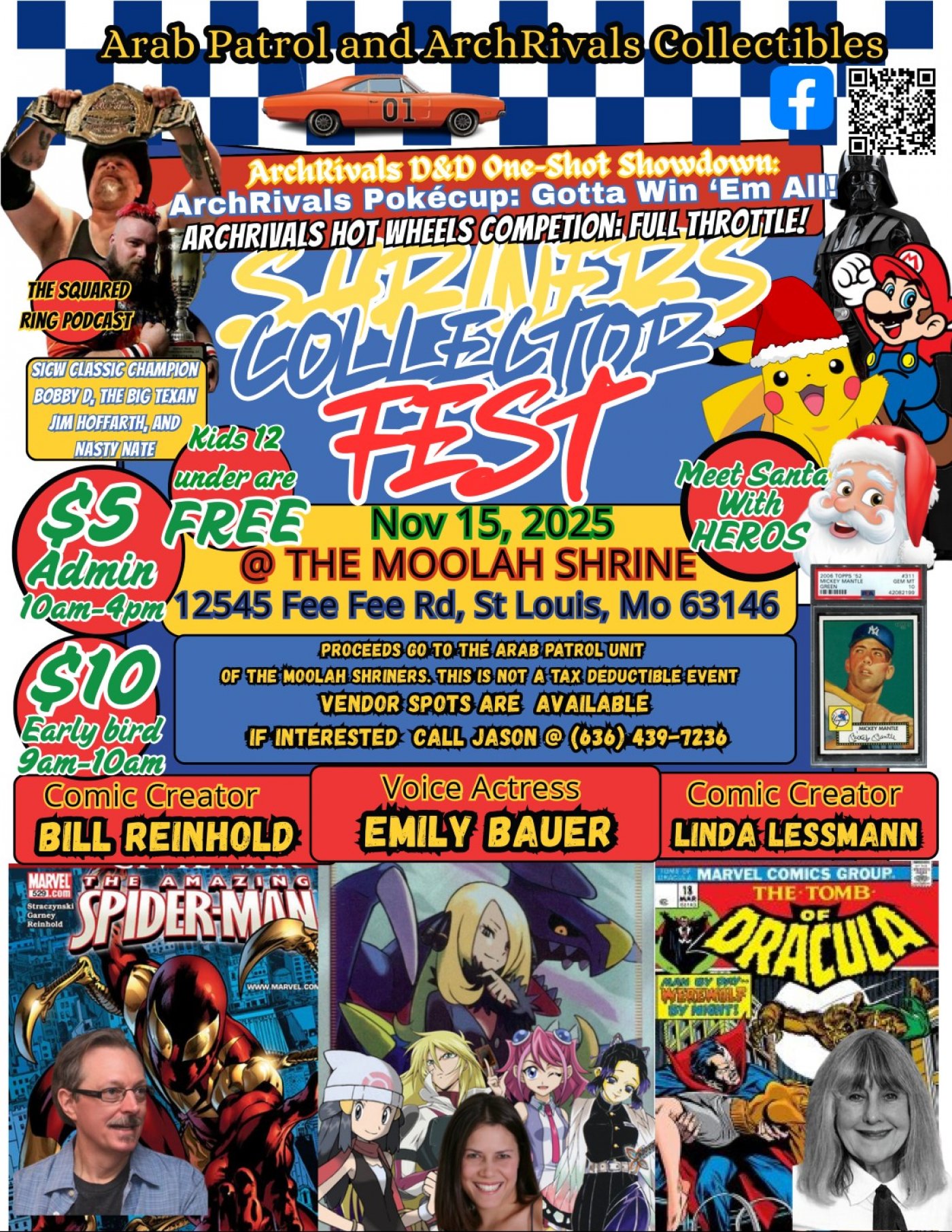Collector Fest 2025 – A Can't-Miss Event! St. Louis get ready for a thrilling day packed with collectibles celebrities and unforgettable experiences! The Arab Patrol of the Moolah Shriners proudly presents Collector Fest 2025 happening Saturday November 15 2025 at 12545 Fee Fee Rd. St. Louis MO 63146!