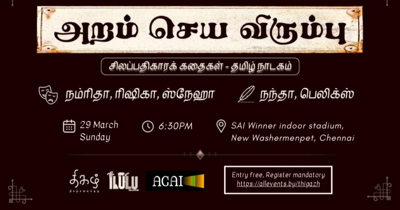 Aram Seya Virumbu is a 60-minute Tamil play inspired by selected stories from Ilango Adigal’s epic Silapadhikaram. The core intent of the play is to explore the many shades of Aram (righteousness), and to reflect on how these values remain deeply relevant in our lives today.