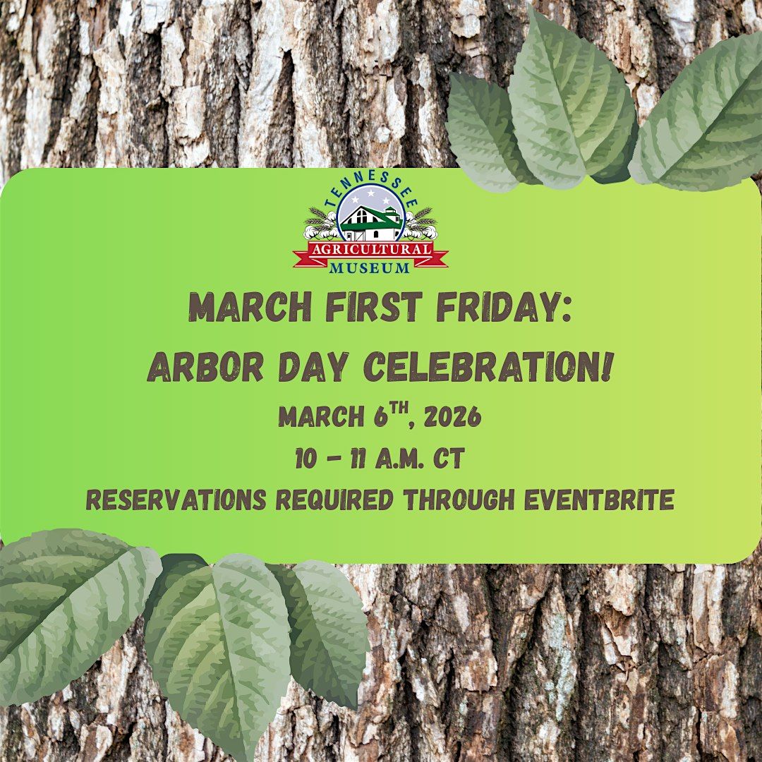Join us for a fun-filled First Friday to celebrate Tennessee's Arbor Day! Learn about nature, trees, and the great outdoors at the Tennessee Agricultural Museum. We will learn about the history of Arbor Day in Tennessee and how important trees are to our ecosystem. Weather permitting, we will conduct bark rubbings on trees by the museum to identify them. The Museum will provide all craft materials.