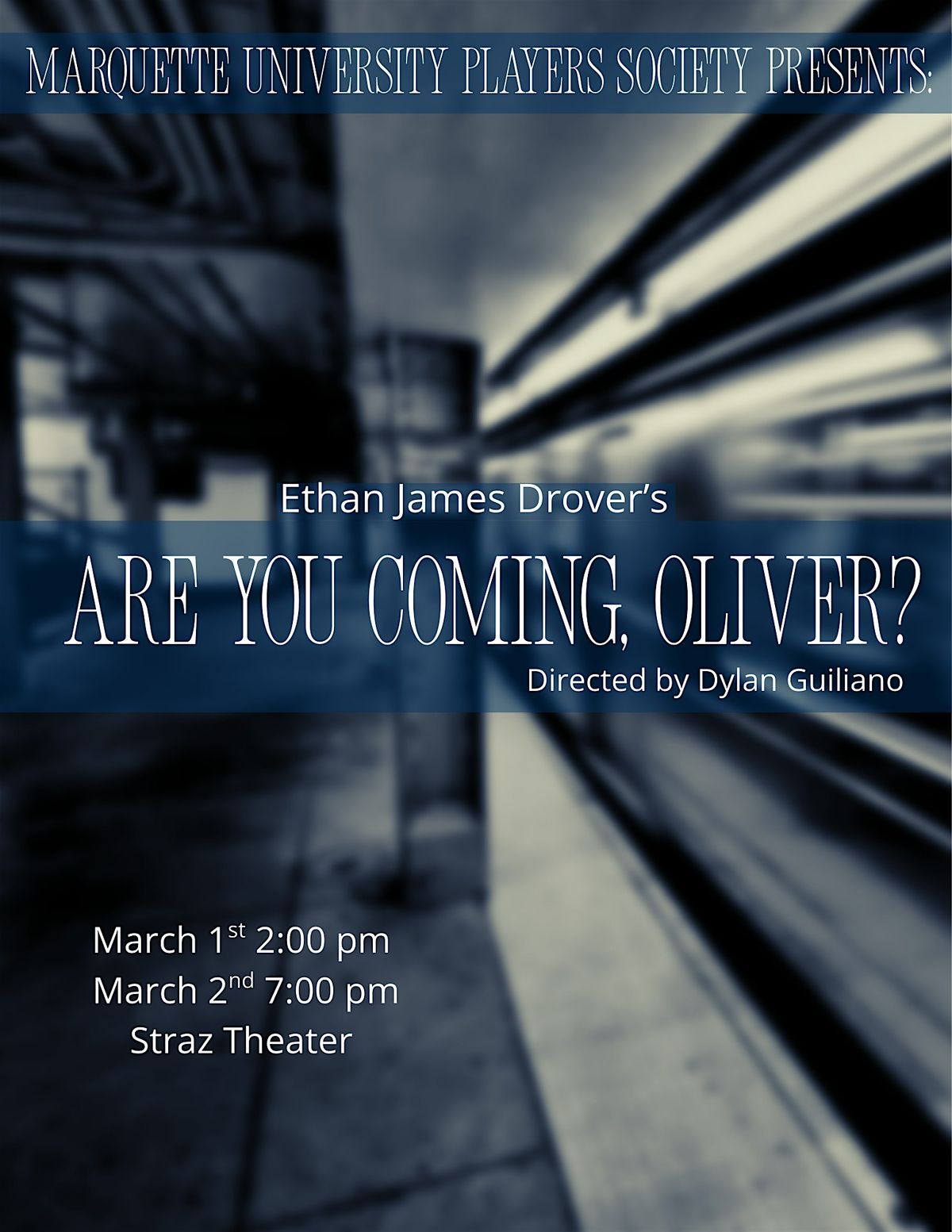 Are You Coming, Oliver? is a one-act drama set entirely in a late-night subway station in NYC, where a young man named Oliver encounters many different strangers while waiting for his train. Each of these interactions forces Oliver to confront different philosophies about life, love, faith, addiction, purpose, and hope. In the beginning, Oliver is closed-off, irritable, and clearly running from whatever problem he is facing. But, as the story progresses, and more and more strangers appear, you'll learn Oliver’s real motives and the real reason he is at a train station so late.