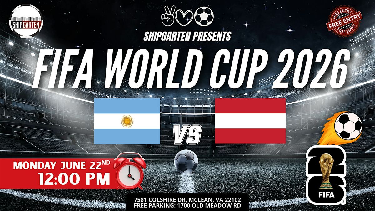 MONDAY SHOWDOWN. PASSION VS PRECISION. Argentina brings flair, intensity, and World Cup legacy.Austria brings discipline, structure, and tactical sharpness. 12PM kickoff.Midday match. Full stadium atmosphere. Shipgarten becomes the biggest World Cup watch party in Tysons. THIS IS HOW YOU WATCH A MONDAY MATCH You step out of work.You grab a cold one.You don’t miss kickoff. Massive screens & stadium-level sound $40 Mix & Match Beer Buckets (5 – 16oz cans) 100+ beer varieties available All ages welcome (21+ to drink) The most energetic World Cup crowd in Tysons This isn’t a casual lunch break. It’s full matchday energy. SOUTH AMERICAN FIRE MEETS EUROPEAN DISCIPLINE Argentina’s creativity and attacking rhythm.Austria’s defensive organization and precision. Monday at noon means the energy starts early and builds fast. Come early. Stay loud. Celebrate every goal. GAME DAY DETAILS Monday, June 22nd Kickoff: 12:00 PM Shipgarten – 7581 Colshire Dr, McLean, VA 22102 FREE & large parking at 1700 Old Meadow Rd FREE ENTRY – Pay only for what you consume Coming with your crew? Upgrade your match day. More Info Click Here The biggest crowd. The coldest beer. The loudest World Cup in Tysons.