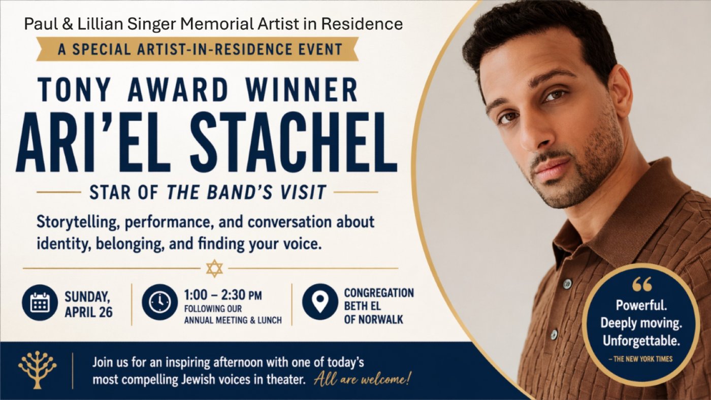 The Annual Paul & Lillian Singer Memorial Artist in Residence is thrilled to welcome Ari'el Stachel to Congregation Beth El.Through powerful storytelling, humor, and music, Stachel explores Jewish identity, belonging, and the search for one’s voice in today’s world.