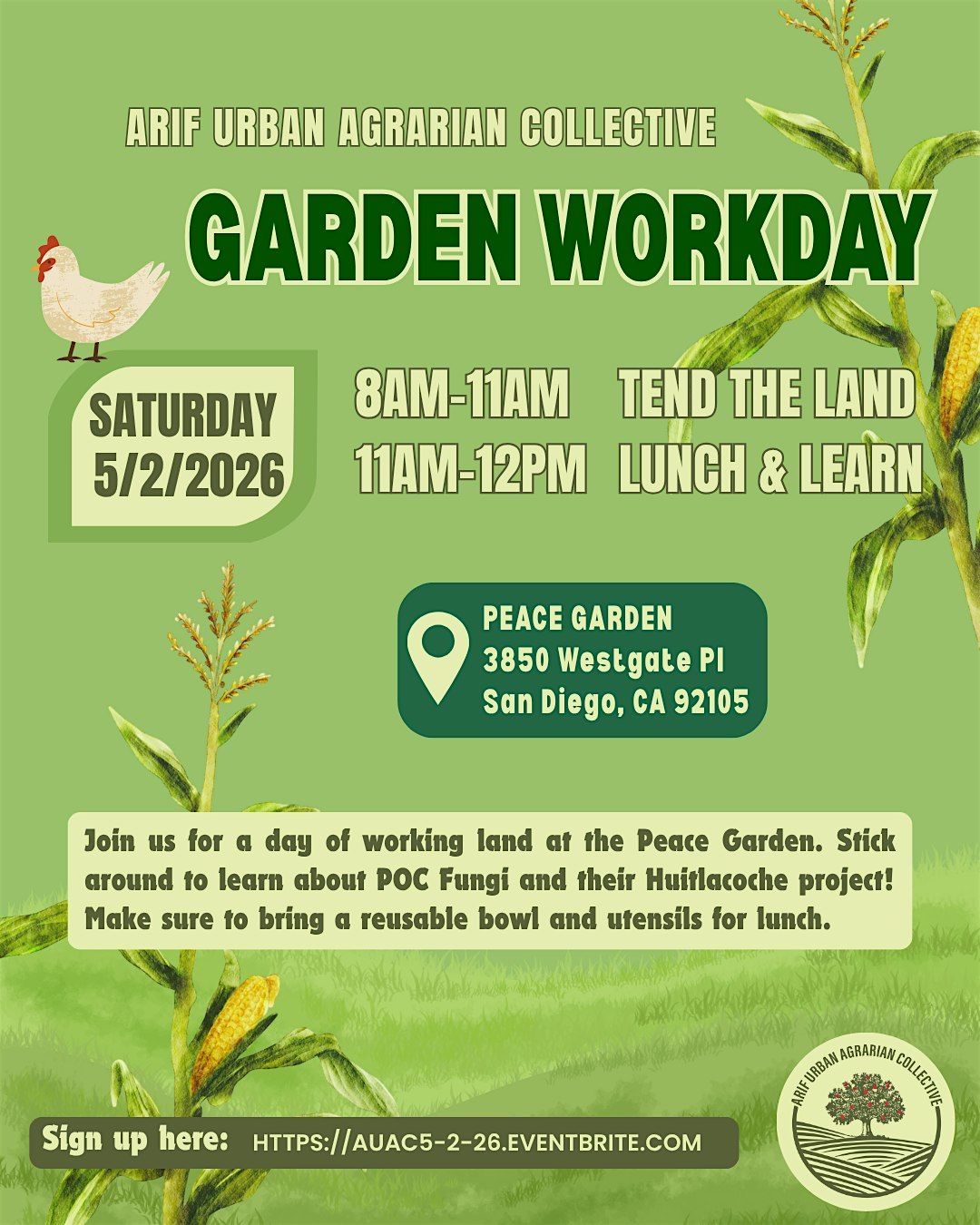 Join our next Arif Urban Agrarian Collective (AUAC) Workday at the Peace Garden!