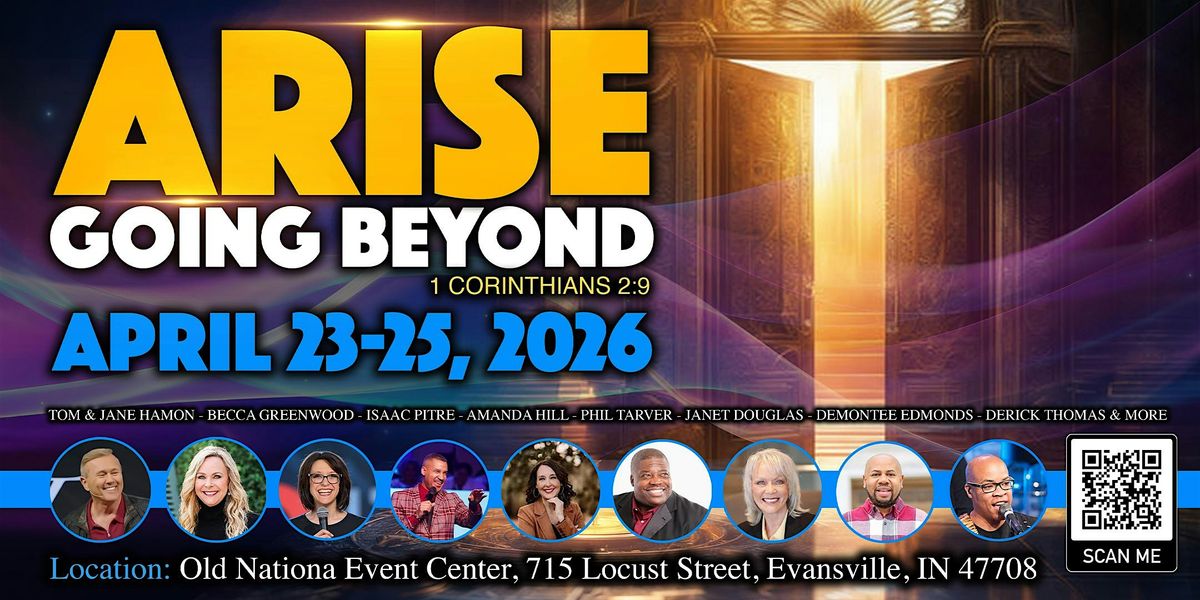 Our 8th Annual ARISE gathering is happening April 23–25th in downtown Evansville, Indiana at the Old National Event Plaza. Last year, the Lord called us to Ascend — "To come up higher and I will show you things which must take place” (Revelation 4). This year, we heard the Lord say we're “Going Beyond” based on 1 Corinthians 2:9: “But as it is written: Eye has not seen, nor ear heard, nor have entered into the heart of man things which God has prepared for those who love Him.”