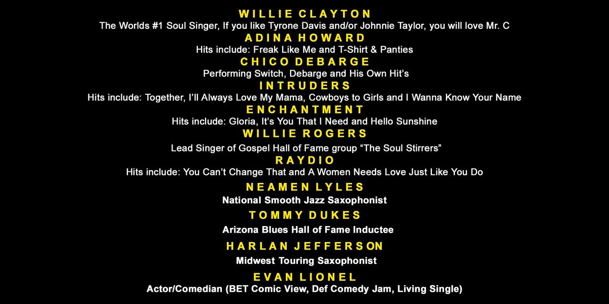 SATURDAY 2/19/22 - Neamen Lyles, Wilie Rogers, Larry Bailey, Harlan Jefferson, Willie Clayton ( Mini Al Green Tribute), Raydio, Chico Debarge and Adina Howard