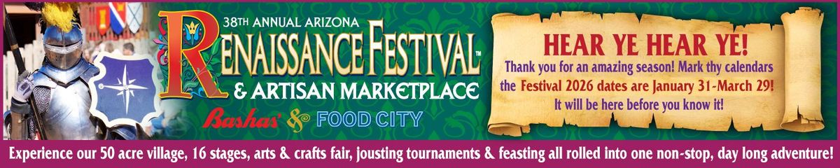 The Arizona Renaissance Festival is a medieval outdoor amusement park, a 16-stage theatre, a 50-acre circus, an arts and crafts fair, a jousting tournament, and a feast, all rolled into one non-stop, day-long, family adventure. The 38th Annual Renaissance Festival is open Saturdays and Sundays, including Presidentsâ Day Monday, from 10 am-6 pm every event day, rain or shine. The festival is open on Saturdays and Sundays from January 31 through March 29, 2026. ([arizona.renfestinfo.com](https://arizona.renfestinfo.com/festival-facts-faqs?utm_source=openai)) The festival is held in Gold Canyon, seven miles east of Apache Junction on US Highway 60. ([arizona.renfestinfo.com](https://arizona.renfestinfo.com/festival-facts-faqs?utm_source=openai)) Tickets purchased online in advance are $36 for adults (ages 13 and up) and $24 for children (ages 5â12); children 4 and under are always free. ([arizona.renfestinfo.com](https://arizona.renfestinfo.com/ticket-prices-info?utm_source=openai)) Parking is free courtesy of Bashasâ and Food City stores. ([arizona.renfestinfo.com](https://arizona.renfestinfo.com/festival-facts-faqs?utm_source=openai)) The festival features 16 stages of nonstop entertainment, including jousting tournaments, circus performers, and a variety of games and rides. ([arizona.renfestinfo.com](https://arizona.renfestinfo.com/entertainment?utm_source=openai)) Themed weekends include Chivalry and Champions, Romance and Royalty, Time Travelerâs Weekend, Pirates Invasion and Brew Fest, Artisan Appreciation, Wizards and Wonder, Celtic Weekend, Viking Invasion, and Closing Weekend. ([arizona.renfestinfo.com](https://arizona.renfestinfo.com/themed-weekends?utm_source=openai)) The festival is wheelchair accessible, with disabled accessible parking, restroom facilities, and designated seating at the Jousting Arena. ([arizona.renfestinfo.com](https://arizona.renfestinfo.com/festival-facts-faqs?utm_source=openai))