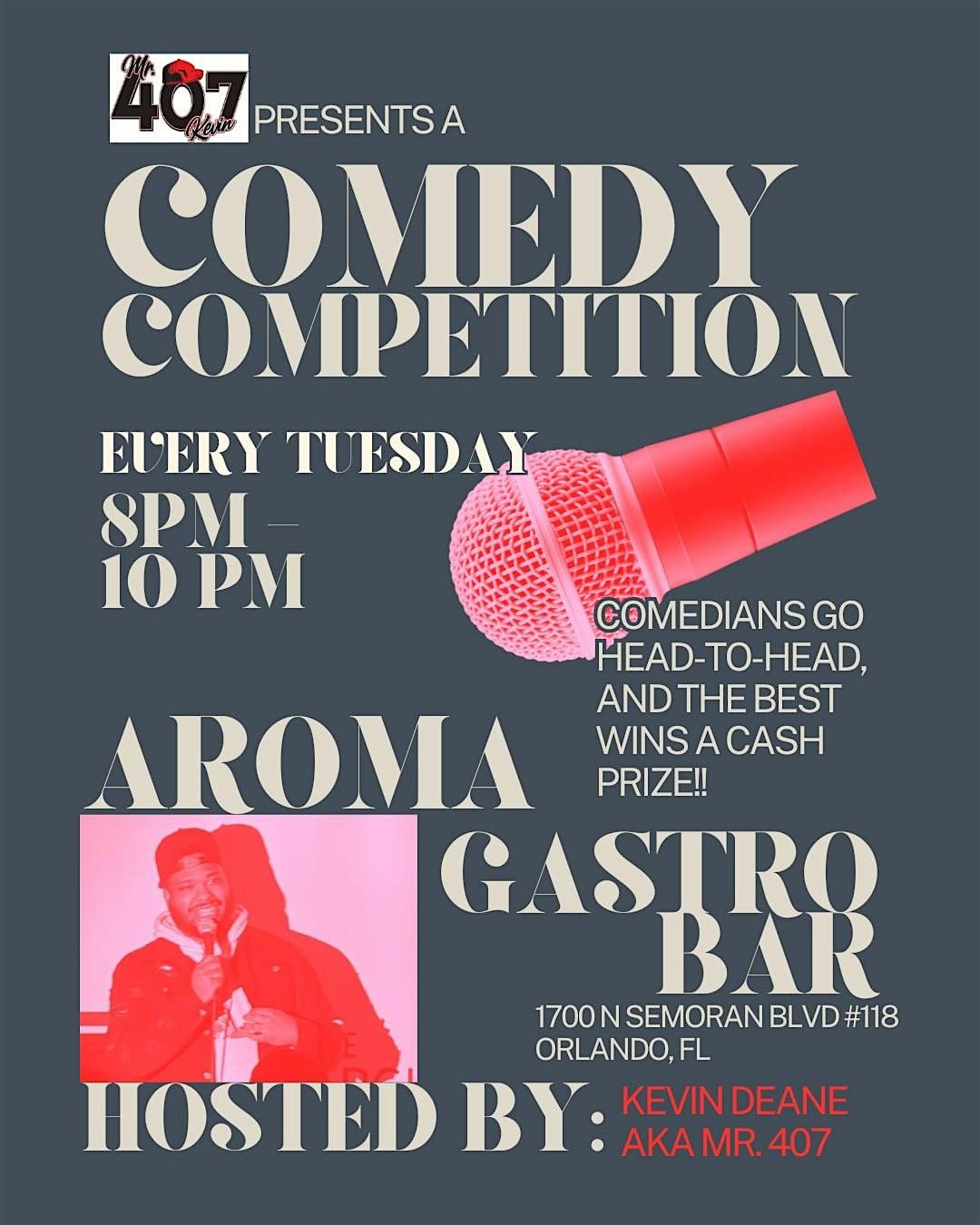 Every Tuesday we put Orlandos funniest comedians head to head to decide whos the best of the best. Aroma Gastro is home to some of the funniest acts in Central Fl great food and amazing cocktails. hosted by 407 Kevin pre game with their happy hour and then show starts at 8pm so grab a seat early it fills up fast