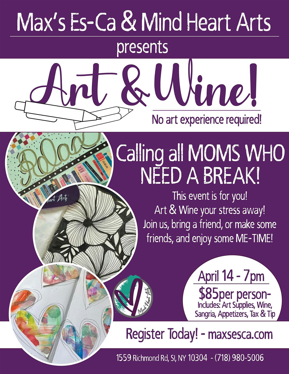 Hey Moms... It's time to take a BREAK! It's TIME to "Art & Wine!" Join Max's Es-Ca & Mind Heart Arts for some Self Care through Art! No Art Experience Needed! Just come as you are, sip some wine, make some art, and enjoy time with friends (or meet new friends who get the mom–life). We all know that feeling where we just need 20 minutes to ourselves.... so let's take 180 minutes to ourselves and "wine" it out! What's included?-Art Journal & Supplies-Guided Therapeutic Art Exercises so you can take time for you-Delicious Appetizers from Max's Es-Ca-Wine, Wine, Wine! Can't wait to Art & Wine the stress away!