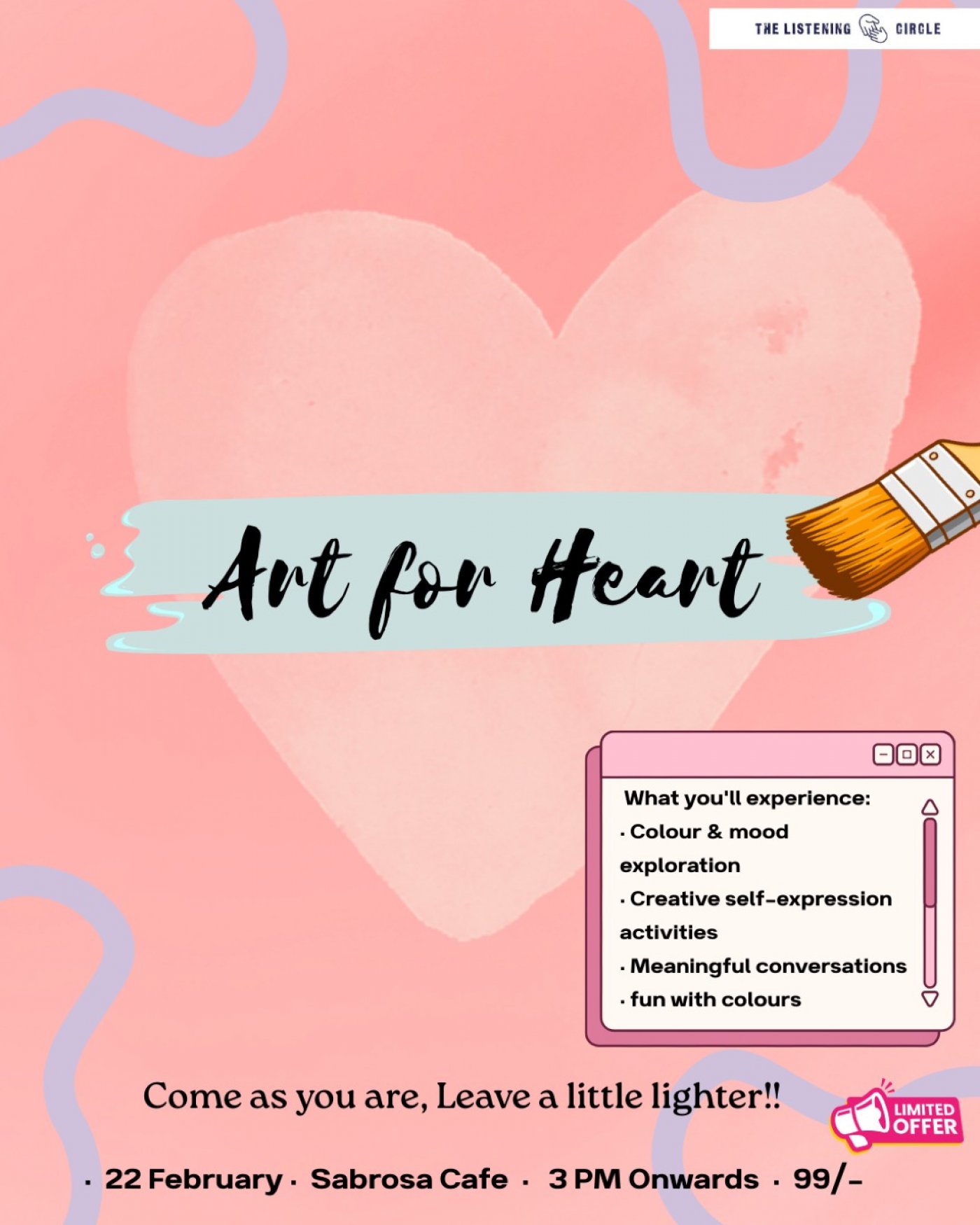 Art for Heart is a calming and creative therapeutic art session designed to help you slow down, reflect, and reconnect with yourself. This experience focuses on emotional well-being, self-expression, and gentle creativity in a warm, supportive environment. No artistic experience is needed—this space is about exploring, not performing.