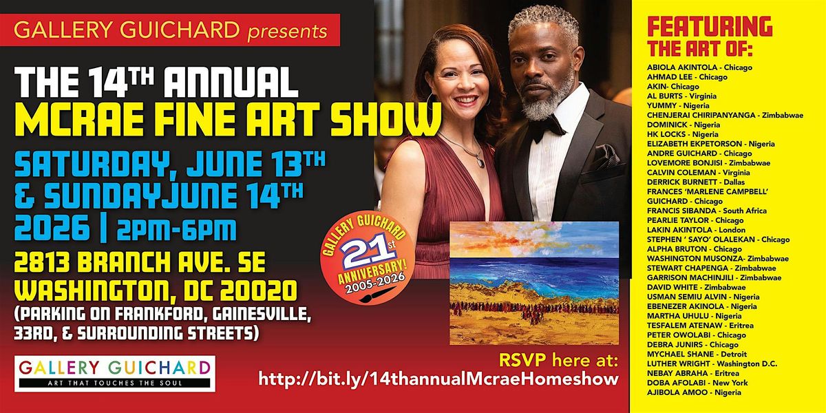 Welcome art lovers! 🎨 Don't miss out on the 14th Annual McRae Fine Art Show in Washington, DC. Join us at 2813 Branch Ave SE on June 13, 2026 at 2 pm (Eastern Time) for a day filled with creativity and inspiration. Discover amazing artworks from talented artists and immerse yourself in the world of fine art. Let's celebrate the beauty of art together! See you there! SEE ART! LOVE ART! BUY ART! LIVE WITH ORIGINAL ART!