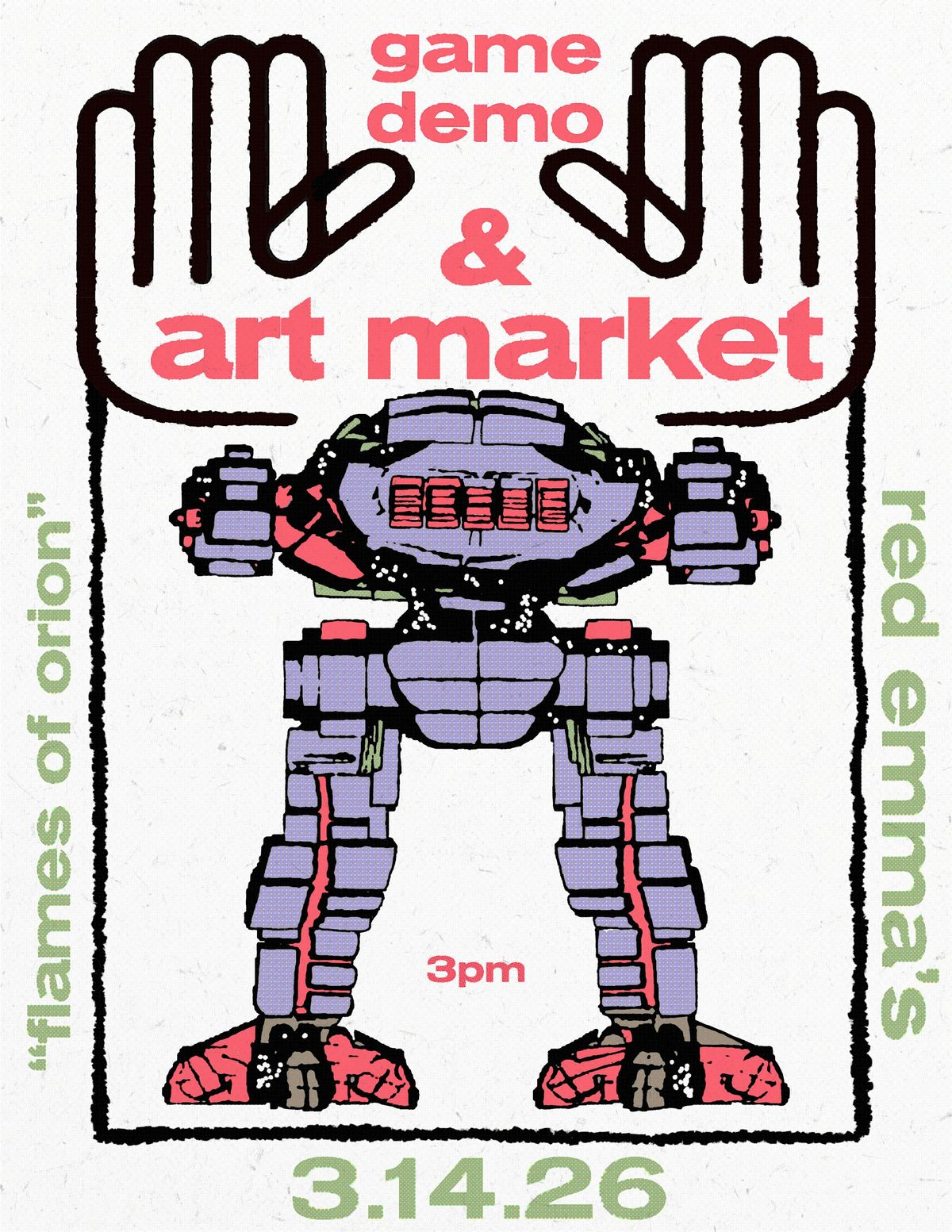 This event will blend the two ideas, offering independent artists selling/distributing zines while others build miniatures and play a game demo of the roleplay and miniature game FLAMES OF ORION.