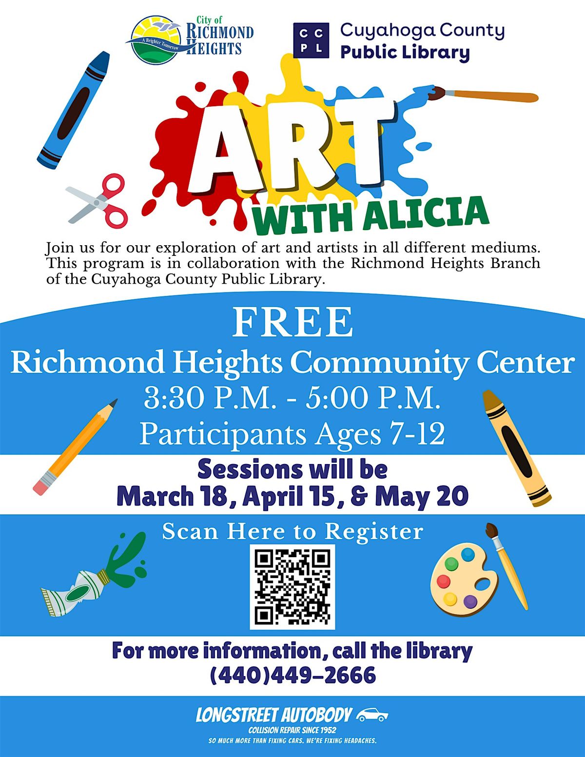 These creative classes introduce kids to a variety of art materials and techniques, encouraging imagination, self-expression, and hands-on exploration. Participants will experiment with paint, collage, drawing, and more in a fun, supportive environment. This program is in collaboration with the Richmond Heights Branch of the Cuyahoga County Public Library.
