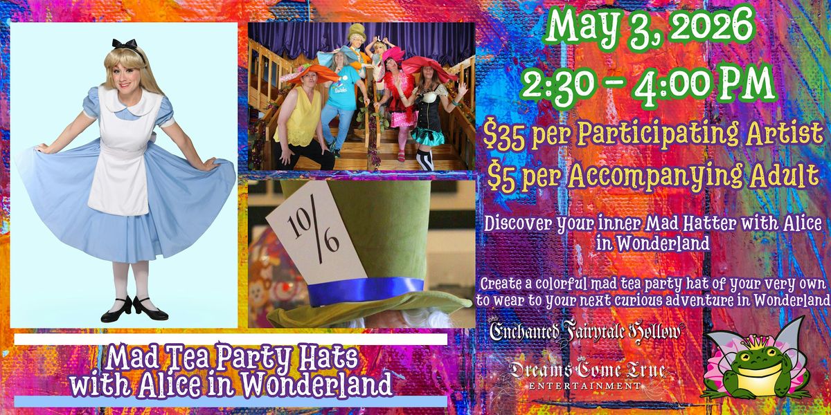Each child artist is required to have an adult accompanying them. If you have additional guests participating, please purchase another ticket for each guest and if you have additional Accompanying Adults, they must also purchase an Accompanying Adult ticket sinceo ur new kingdom has limited space. Art projects will be taken home the day of the class unless the class is part of a special series class where it will be worked on over multiple sessions. (This Session includes: Alice in Wonderland helping all of our royal guests create their own mad tea party hat-1 Session Class)