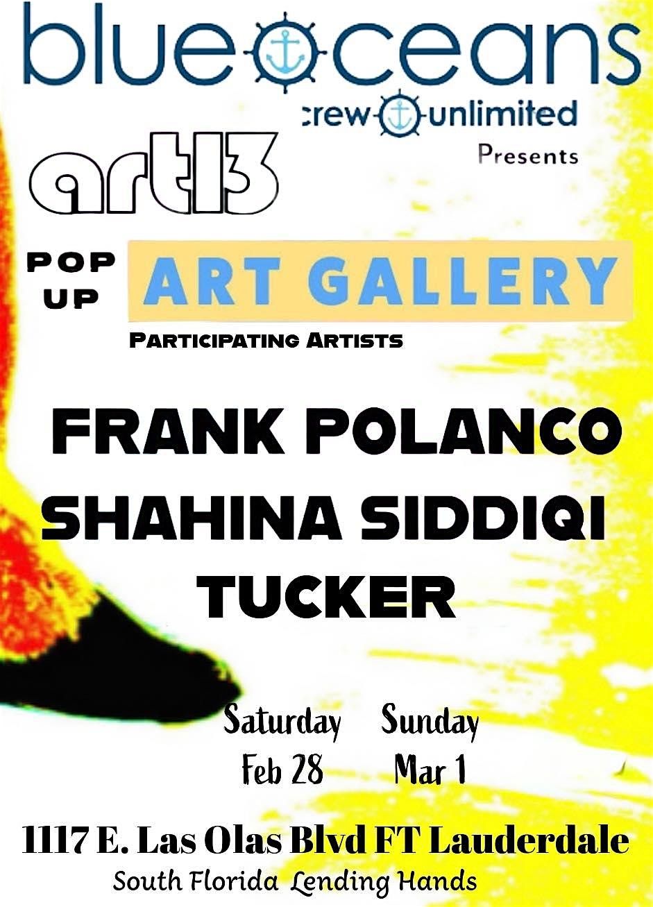 Join local artists Frank Polanco, Shaina Siddiqi, and Tucker during the Las Olas Art Fair at the ART13 Pop-Up Gallery, located inside the offices of Blueoceans Yachting at