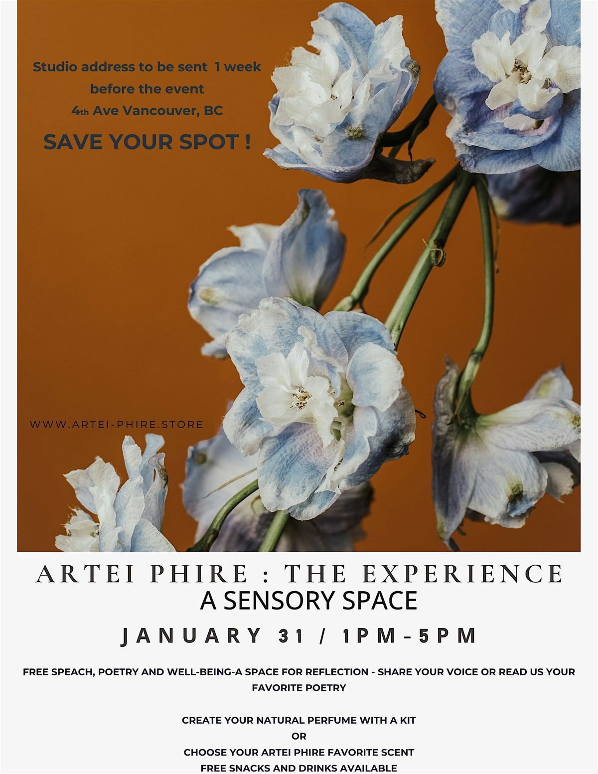 Snacks and drinks available for attendees. Feel the magic unfold! Artei Phire is about using natural perfumes for well-being. Elevate every day moment with us !