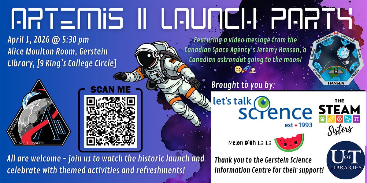 Join us for an out-of-this-world celebration of the Artemis II mission blastoff! We aim to have a stellar evening featuring a screening of the historic launch itself, alongside themed light refreshments, hands-on activities, themed trivia, and more! Weather and availability depending, we may even have the chance to check out a telescope tour! All are welcome at this event, brought to you by the Let's Talk Science Outreach Site at the University of Toronto, St. George, The STEAM Sisters, and Melon D'Oh La La programming. We are over the moon to share our love for space and hang out with fellow enthusiasts!
