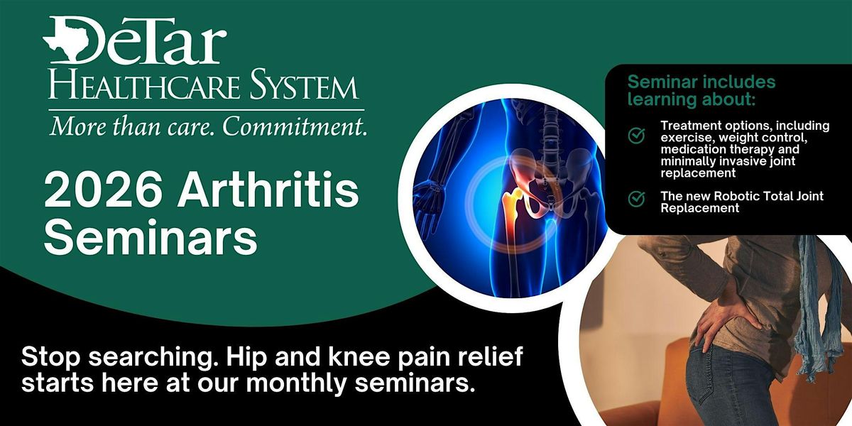 Did you know that Arthritis doesn’t have to slow you down? Join us every month for free seminars where we talk about the best treatment options for hip and knee pain—including Robotic Total Joint Replacement! Seminars are held at DeTar Hospital Navarro in our MediCenter, which is located across the street from the parking garage, in our Education Classroom.