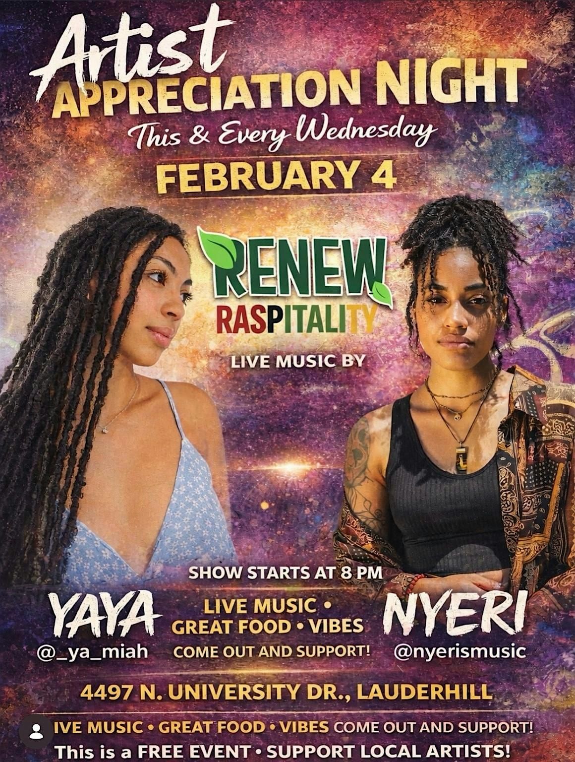 Join us for a night of live music, great food, and elevated vibes featuring Yaya @_ya_miah and Nyeri @nyerismusic. Come out, support local artists, and be part of something special. Music by @d.j._don_julio. Calling all creatives! If you’re a singer, musician, comedian, artist, poet, fashion designer, or creative of any kind—this is the place to showcase your talent. We’re about community, creativity, and collective support. Pull up, bring a friend, and let’s grow together.