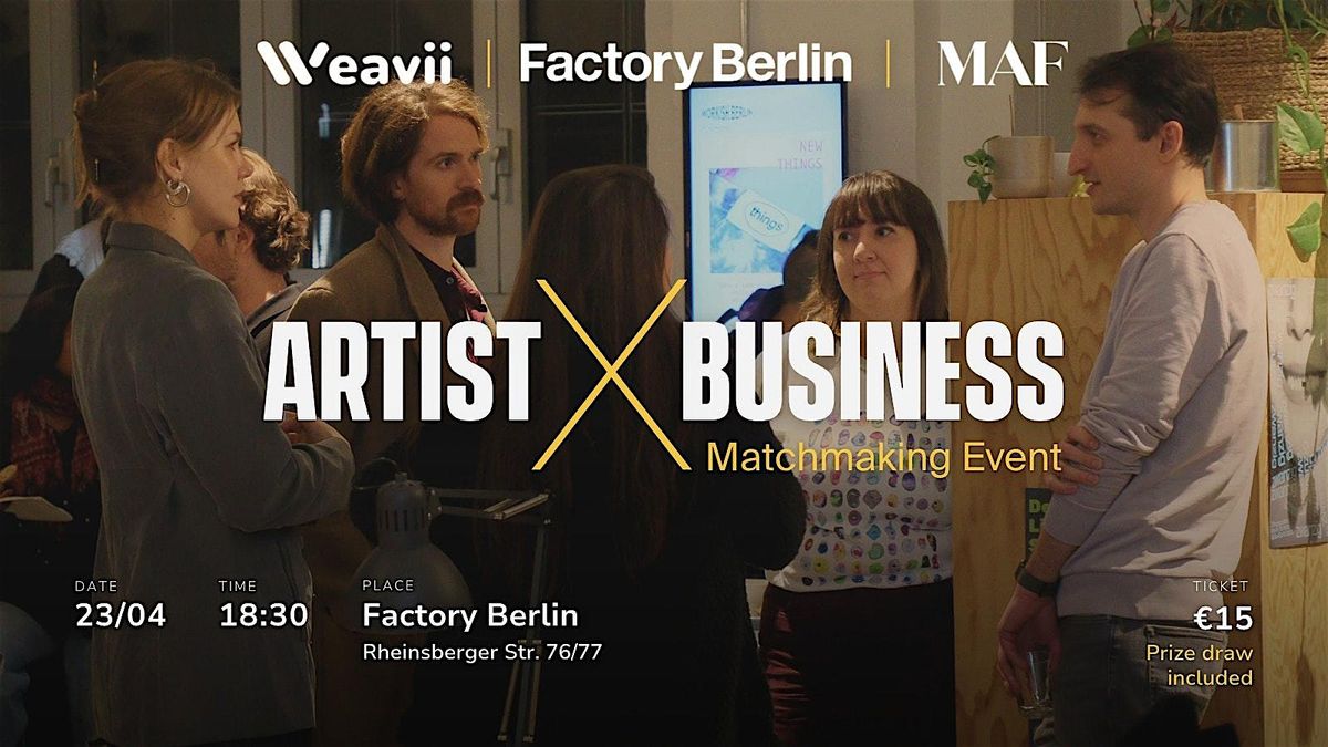 Weavii, Factory Berlin, and Mastermind Alliance Film Studios (MAF) are inviting 100 artists, founders, creative professionals, and businesses for Berlin's largest artist-business matchmaking evening. The format is simple: before you arrive, you fill in a short profile. We use it to pre-curate your matches. You walk in, sit down, and meet people who are actually looking for what you offer.