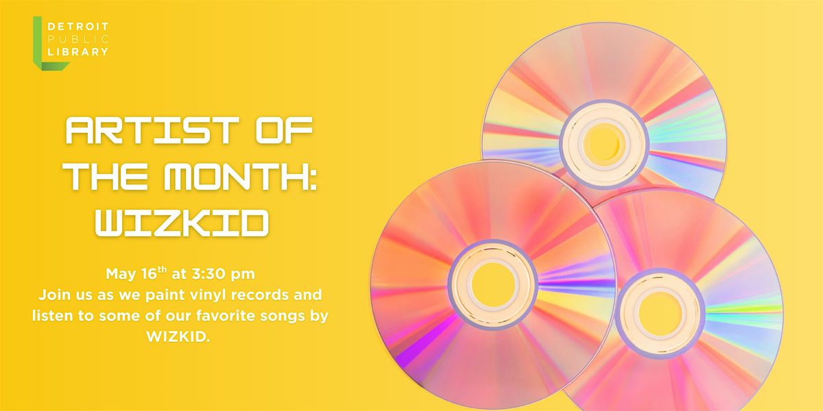 Come hang out with us at Elmwood Park | Detroit Public Library on May 16, 2026 at 3:30 PM (ET) to celebrate the amazing WizKid as our Artist of the Month! Expect good vibes, cool tunes, and a chill atmosphere. Let your creativity flow by painting a vinyl record inspired by your favorite song by WizKid. Don't miss out on this in-person event where you can connect with fellow fans and enjoy some great music. See you there!