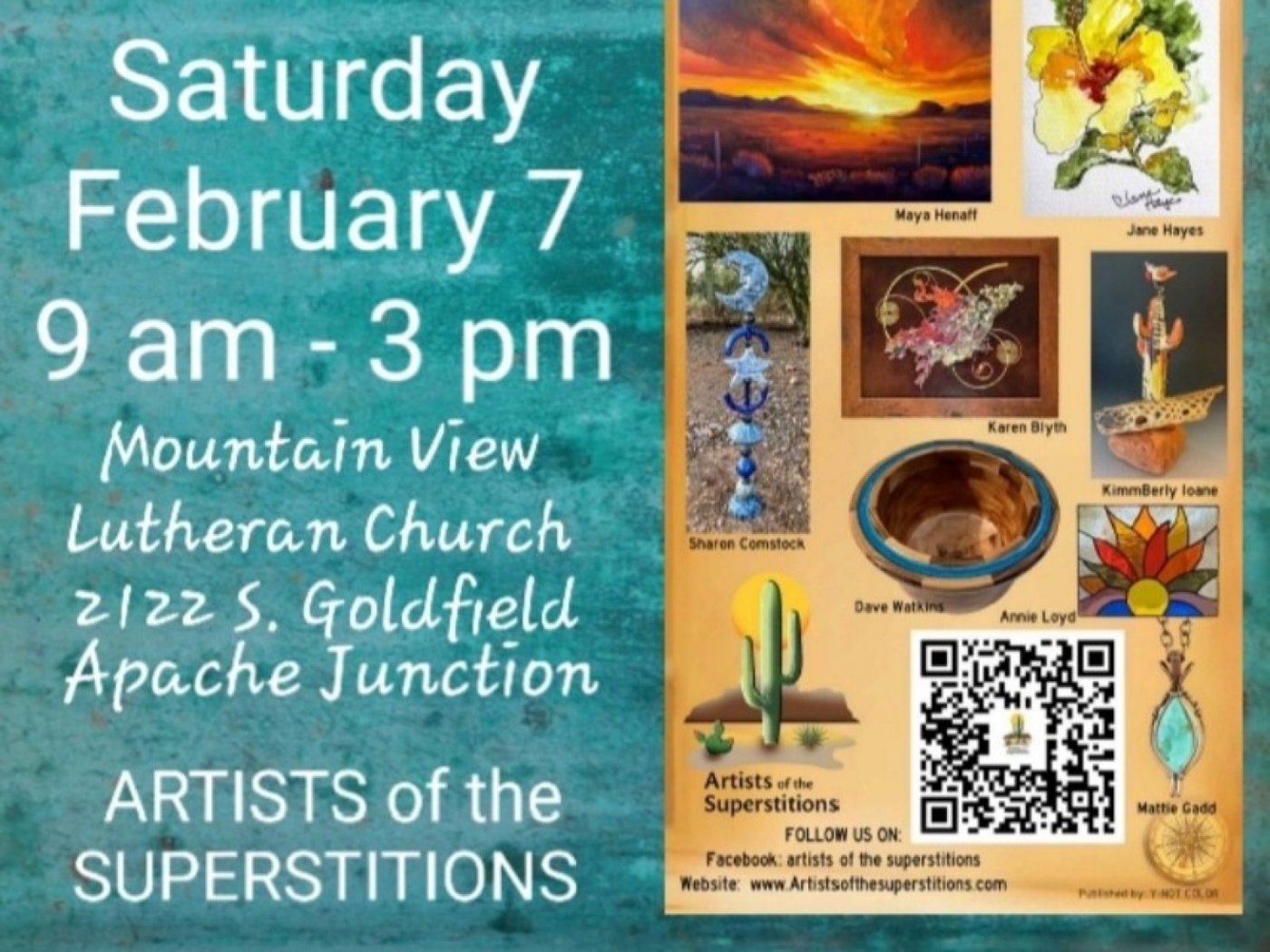 Fine Arts Show by Artists of the Superstitions. Hand crafted art in a variety of mediums, including jewelry, pottery, photography, woodwork, painting, fiber art, glass, and more! Indoor/outdoor show, FREE admission and plenty of parking!