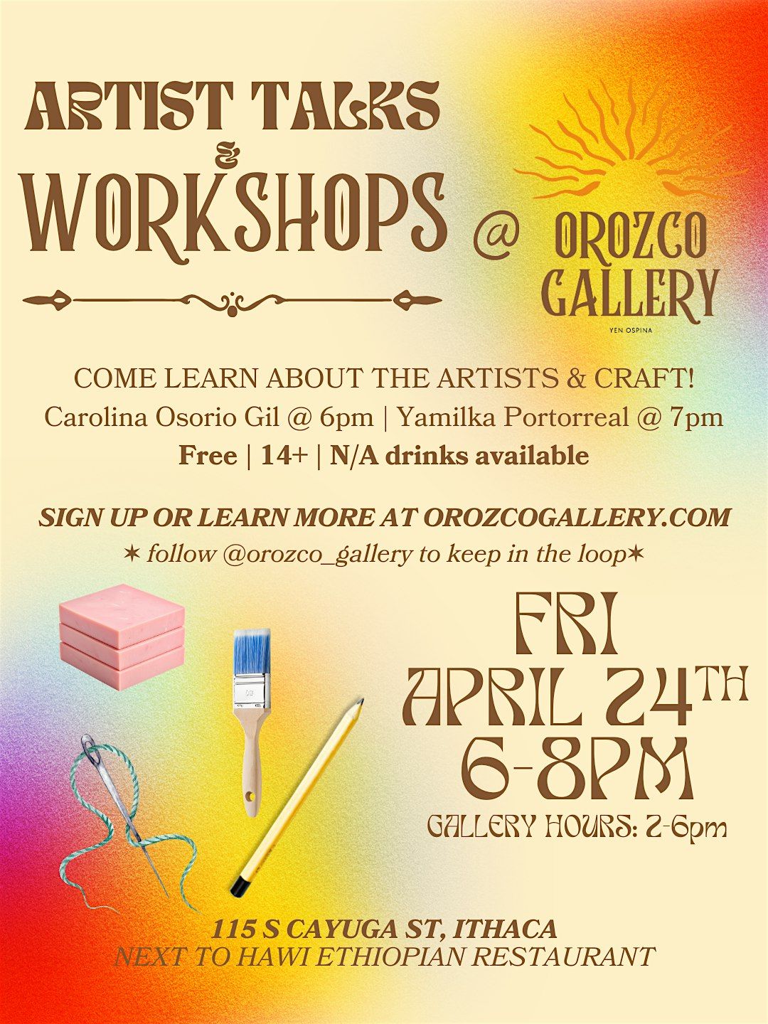 This April, Orozco Gallery opens its doors for a month-long pop-up filled with arts & culture in Downtown Ithaca. Featuring artist talks, live music, dance, storytelling, and hands-on workshops, this welcoming sober space invites all ages to gather and celebrate the transformative power of art.