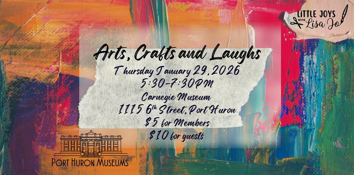 Join us for our "Arts, Crafts and Laughs" workshop at the Carnegie Museum! Little Joys with Lisa Jo welcomes fellow crafters to join her for a fun evening of crafts, creativity and laughs! Bring in the current craft you're working on, all the while making new friends with like-minded people to share ideas, dreams and imagination! This is a beginner friendly workshop as well, so birng in your own art of craft items you are working on such as painting, current knitting project, a junk journaling project or more!