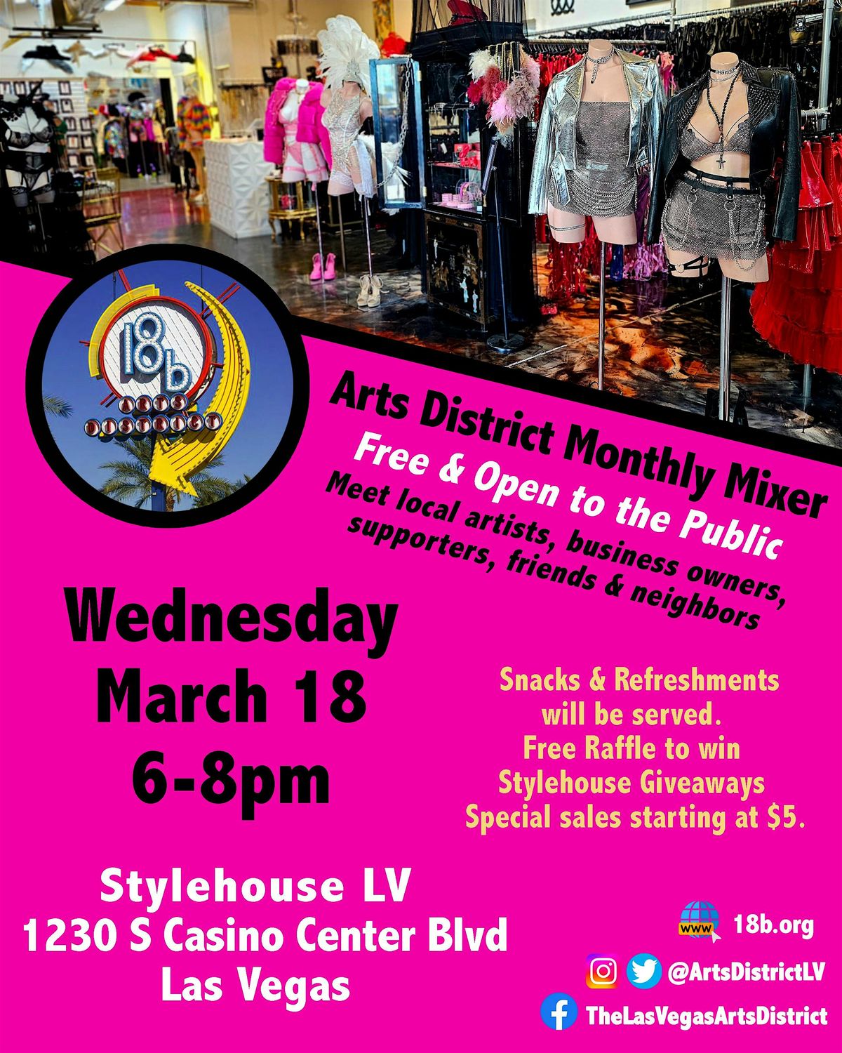 Join us for our next Arts District Mixer, happening on the 18th of every month. On Wednesday, March 18, we’re shopping ’til we drop at 18b board member Tinna Lee’s boutique: Stylehouse LV — a bold Las Vegas style destination for custom looks, standout fashion, and creative energy.