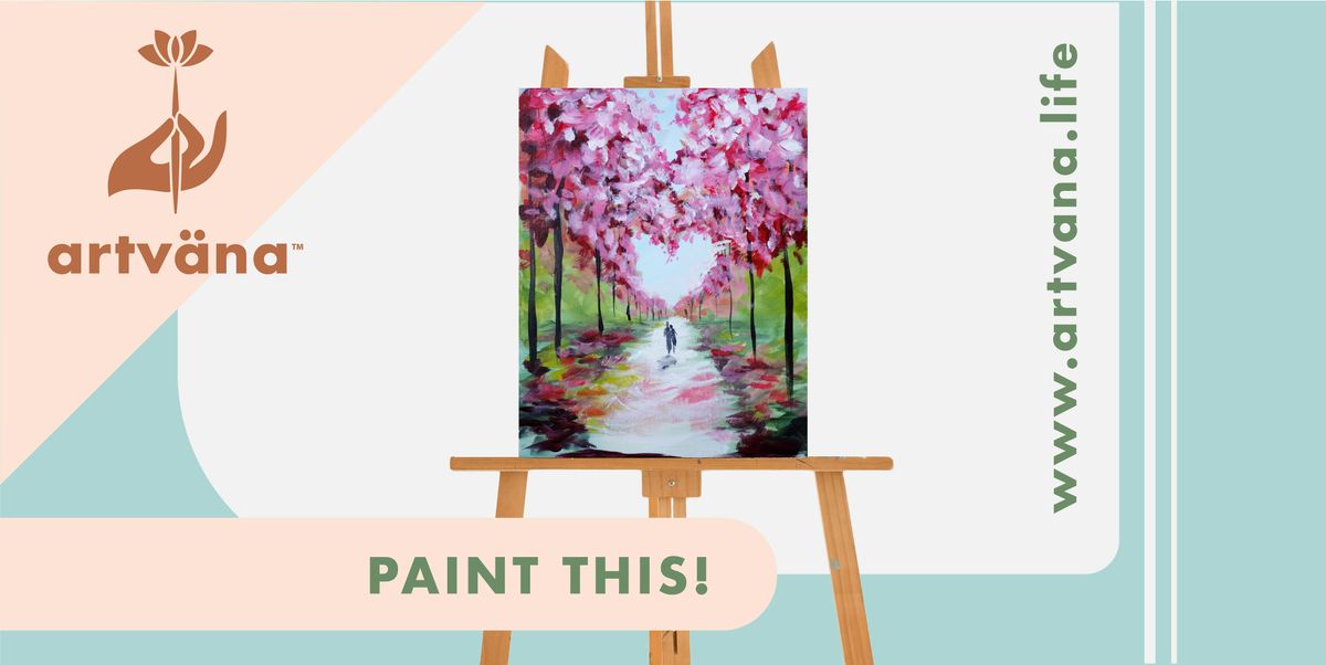 This week we’re painting the “Lovers Path” on canvas, great for beginners and experienced painters alike. Your Artvana Artist Coach will guide you step-by-step as you create your own beautiful canvas