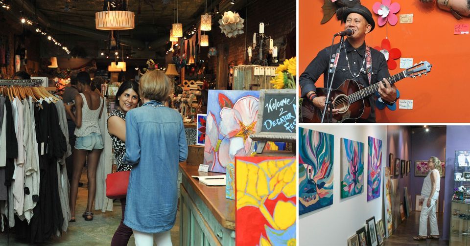 ArtWalk is a fun (and free!) city-wide art experience. Stroll around Downtown Decatur, enjoying free art openings at local shops and businesses while enjoying light refreshments. Mingle with the artists as they discuss their work, and catch a vibe with music on the Square throughout the evening. ArtWalk is the kick-off event for the Decatur Arts Festival; find more information on the decaturartsfestival.com.