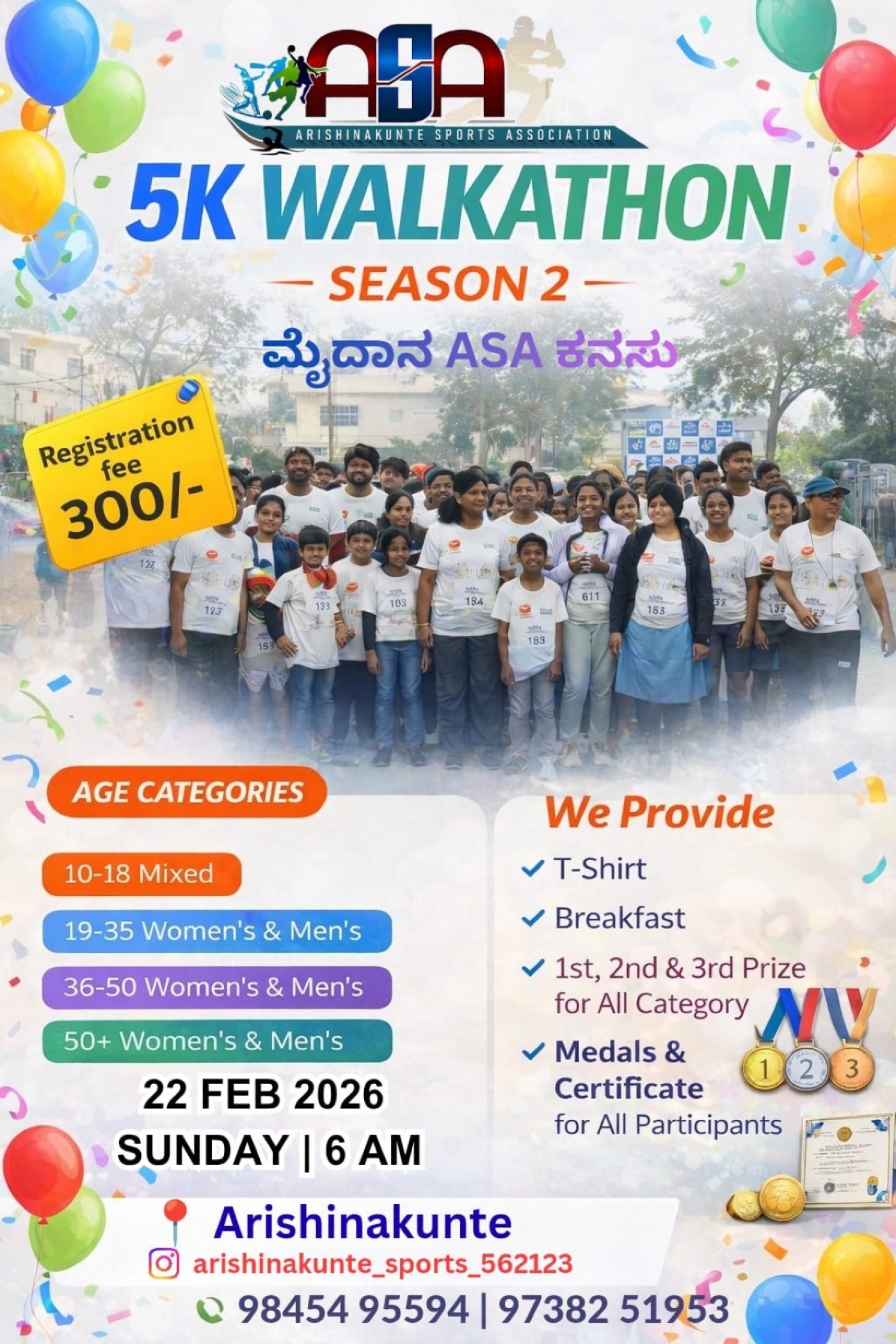 Join us for an exhilarating experience at ASA Walkathon Season 2 hosted by Arishinakunte Sports Association. Lace up your shoes and get ready to walk for a cause on February 22, 2026, starting at 6:00 AM in Arishinakunte, Bangalore.