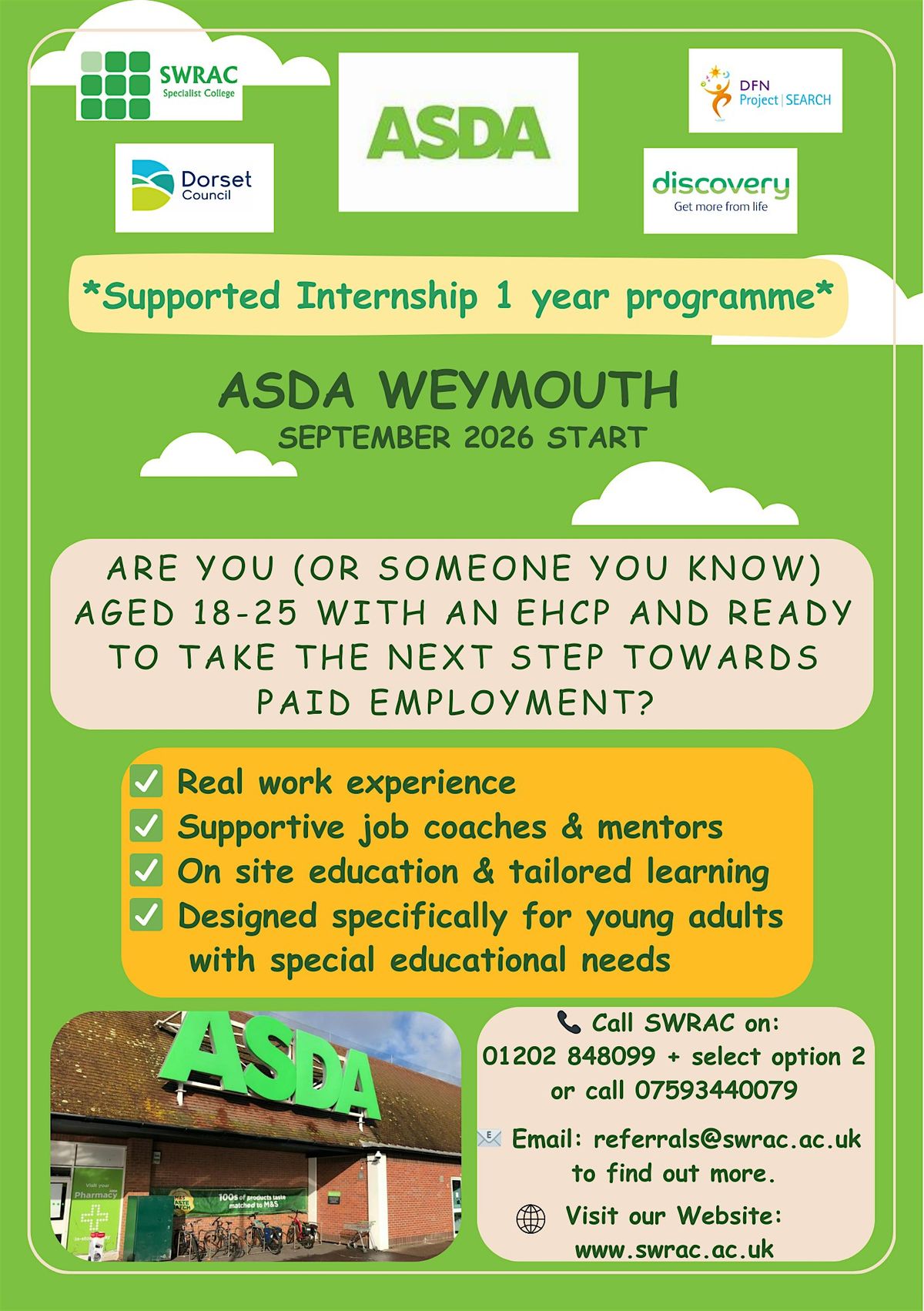 This event will provide all the information and support needed to help you make an informed decision about your future. You will receive training in work-related activities, take part in a meaningful work placement within ASDA, Weymouth to develop the skills required for employment.