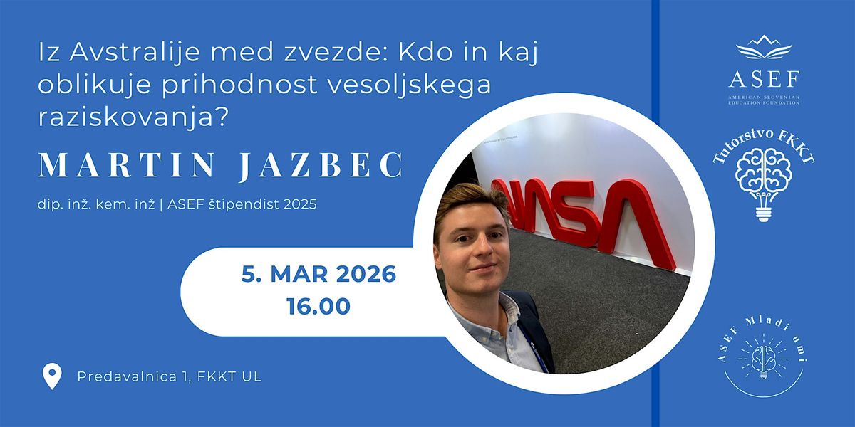 ASEF Mladi umi v soorganizaciji s Tutorstvom FKKT pripravljajo poljudnoznanstveno predavanje s področja vesoljskih znanosti in aktualnih trendov v vesoljski industriji, ki ga bo imel ASEF štipendist generacije 2025 Martin Jazbec.