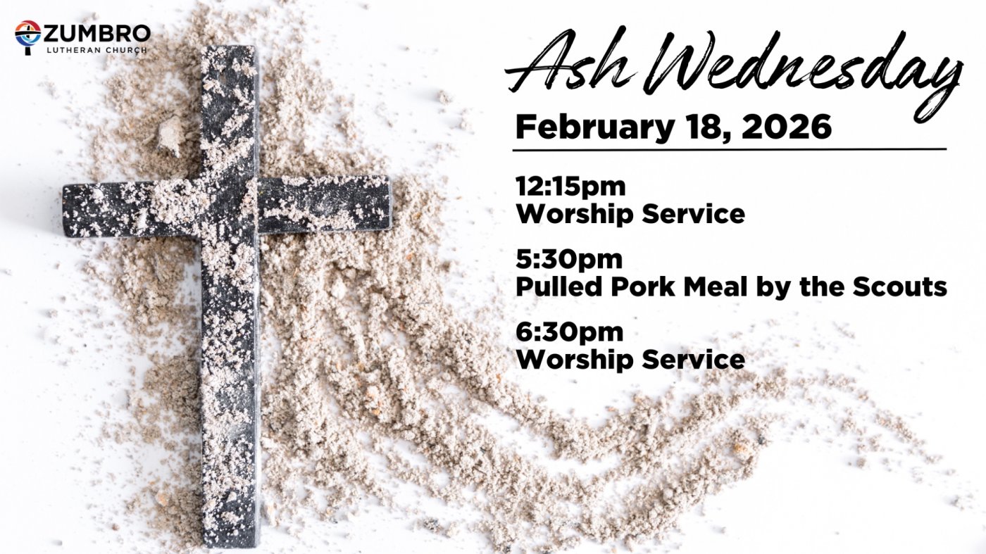 Lent begins Wed., Feb. 18 on Ash Wednesday with two special services--both with imposition of ashes--one at 12:15pm (service only; no meal) and one service at 6:30pm with a pulled pork meal at 5:30pm in the Gathering Place provided by the Scouts Troop 82. All are welcome at Zumbro.
