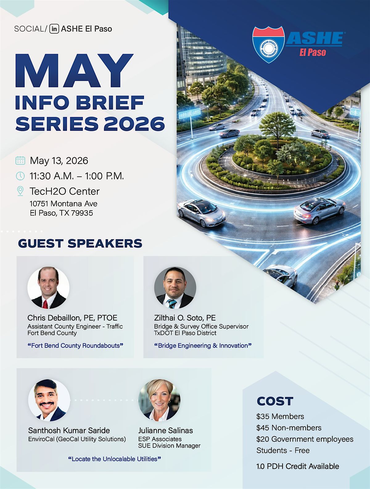 Join the ASHE El Paso Section for our Info Brief Series, a dynamic lunch session focused on emerging trends, technology, and innovative practices shaping the future of transportation and infrastructure. This event features concise, high-impact technical presentations (15–20 minutes each) followed by Q&A, offering valuable insights you can apply in your daily work.