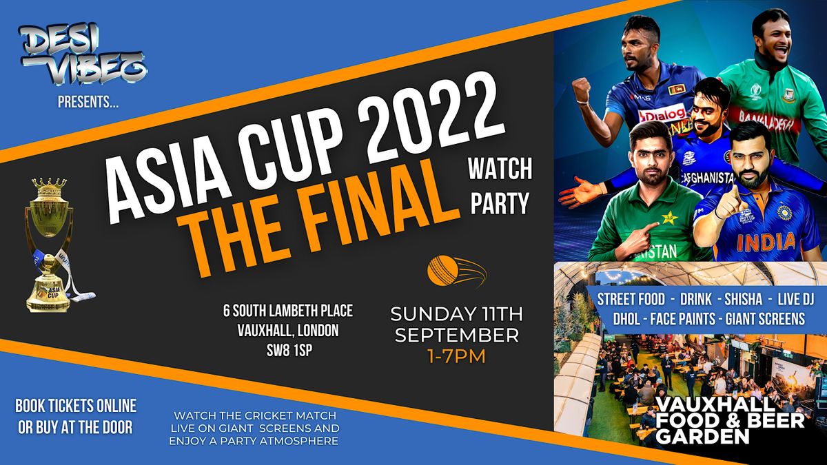 Watch the Asia Cup 2022 cricket final Iive on giant screens and enjoy a party with street food, drinks, live dj, dhol players and more.About this Event