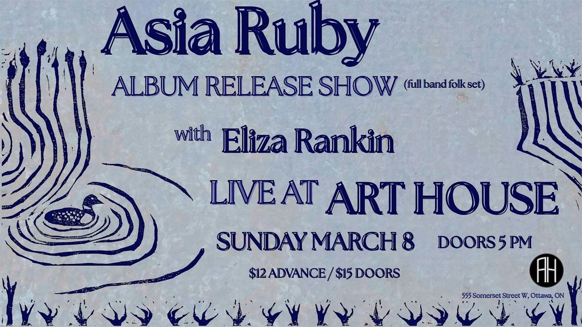 Asia Ruby shares her debut album in a never-before-seen full band show, bringing familiar songs to life with fresh energy and depth. Blending stripped-back folk storytelling with subtle instrumental interplay, she is supported by Aaron on bass and Wil on drums. Her lo-fi Americana folk sound unfolds into dynamic arrangements that reveal her music in a whole new way, creating an intimate listening-room experience rooted in emotional songwriting and warm, textured grooves. Opening the evening is Ottawa favourite Eliza Rankin.Bios