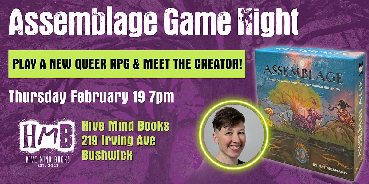 Join us at Hive Mind Books for a special game night to celebrate the release of Assemblage, a brand new queer science-inspired eco-fantasy TTRPG (table top role playing game). Meet the creator, Nat Mesnard, who will share about the process of how they created the game, and then we'll play Assemblage!