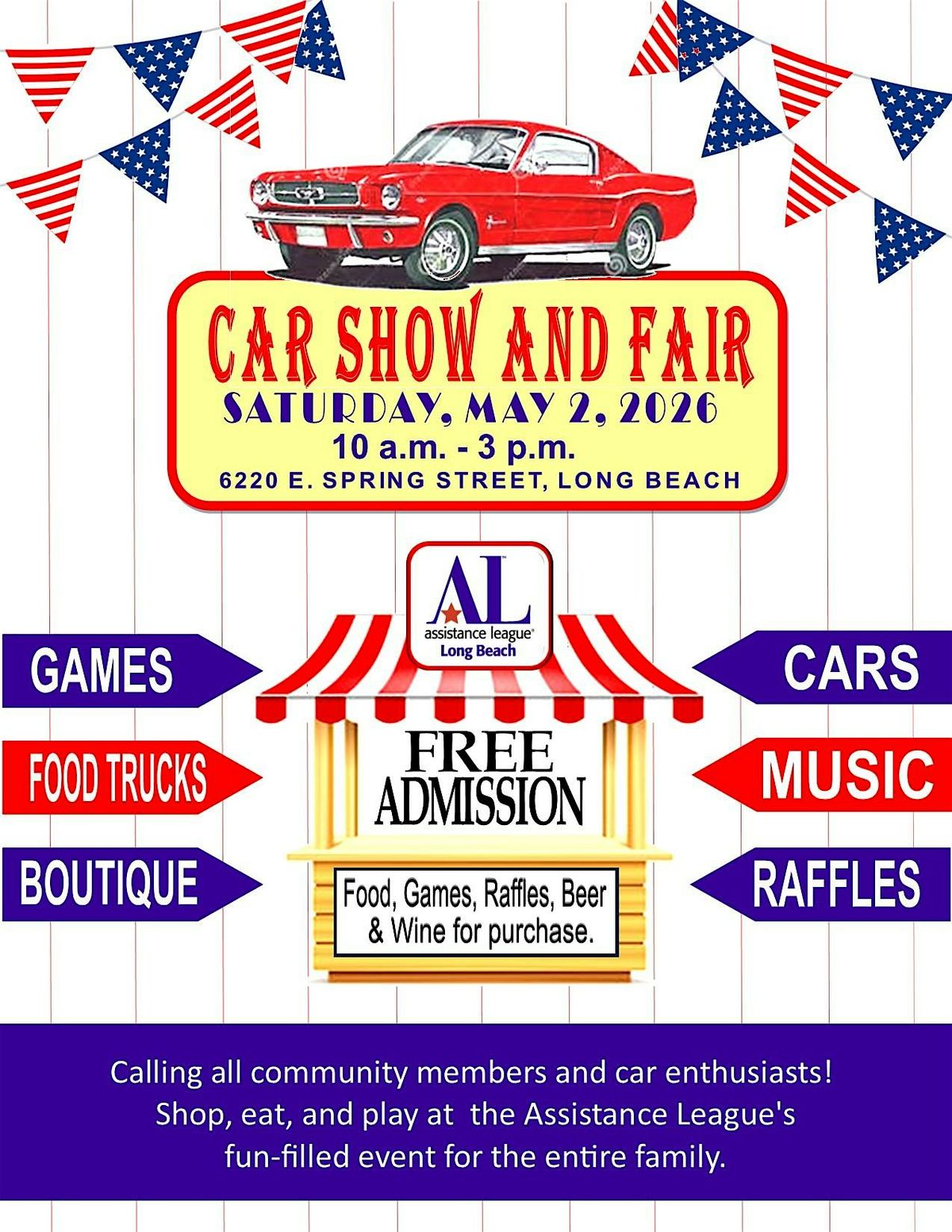 Free Car Show & Fair May 2 at Assistance League of Long Beach—40+ cars, vendors, food, music, and fun supporting local programs.